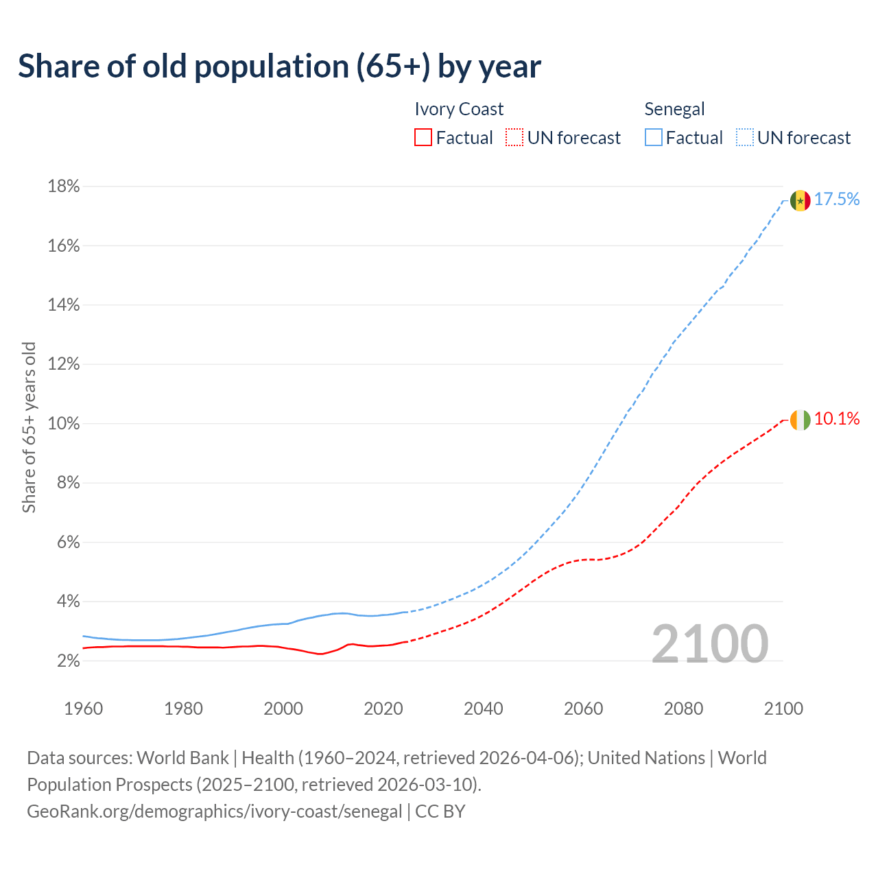 The share of older people aged 65 and over is 2.61% in Ivory Coast and 3.62% in Senegal. Life expectancy in Ivory Coast compared to Senegal .