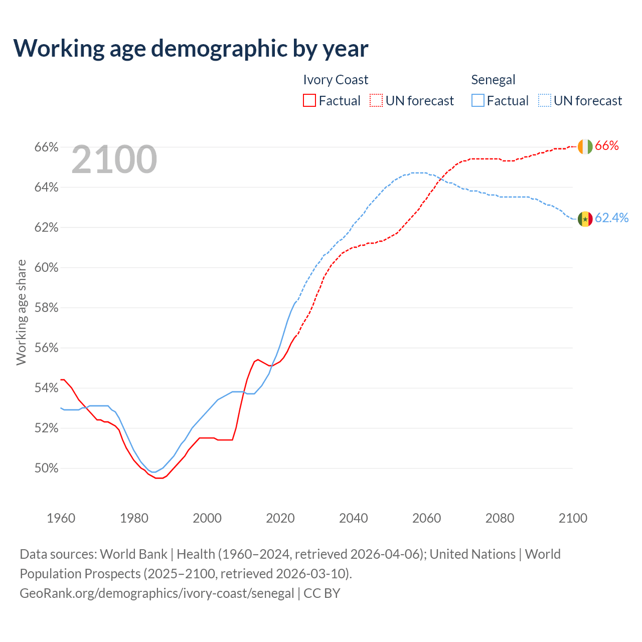 - Ivory Coast has 19.1M working age adults (aged 15-64) vs 11.3M in Senegal.