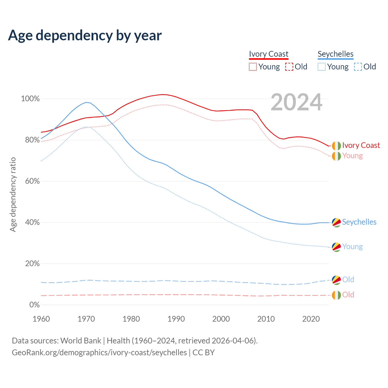 - Ivory Coast is ranked 175/196 by median age (oldest to youngest) vs 76/196 for the Seychelles.