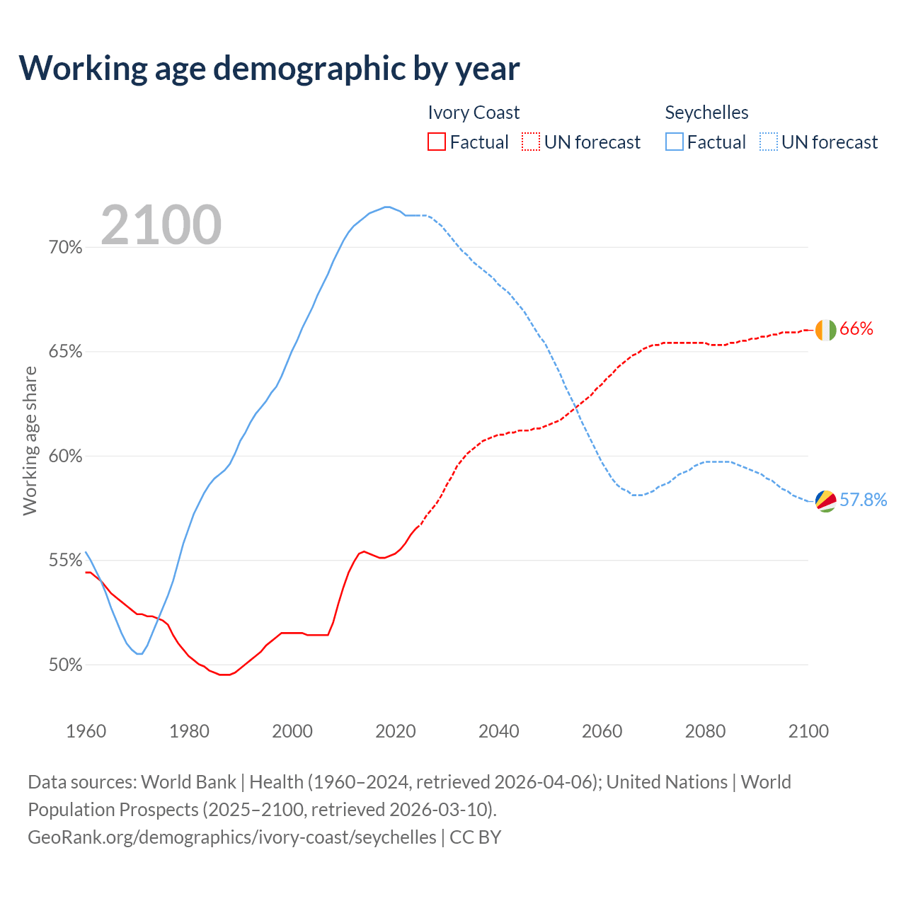 - Ivory Coast has 19.1M working age adults (aged 15-64) vs 90.3K in the Seychelles.