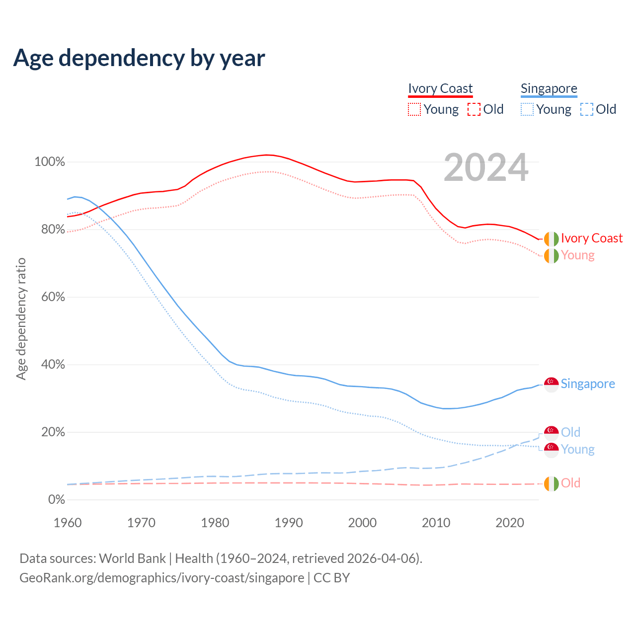 - The share of old-age demographic (65+) in Ivory Coast is 2.61% vs 13.7% in Singapore.