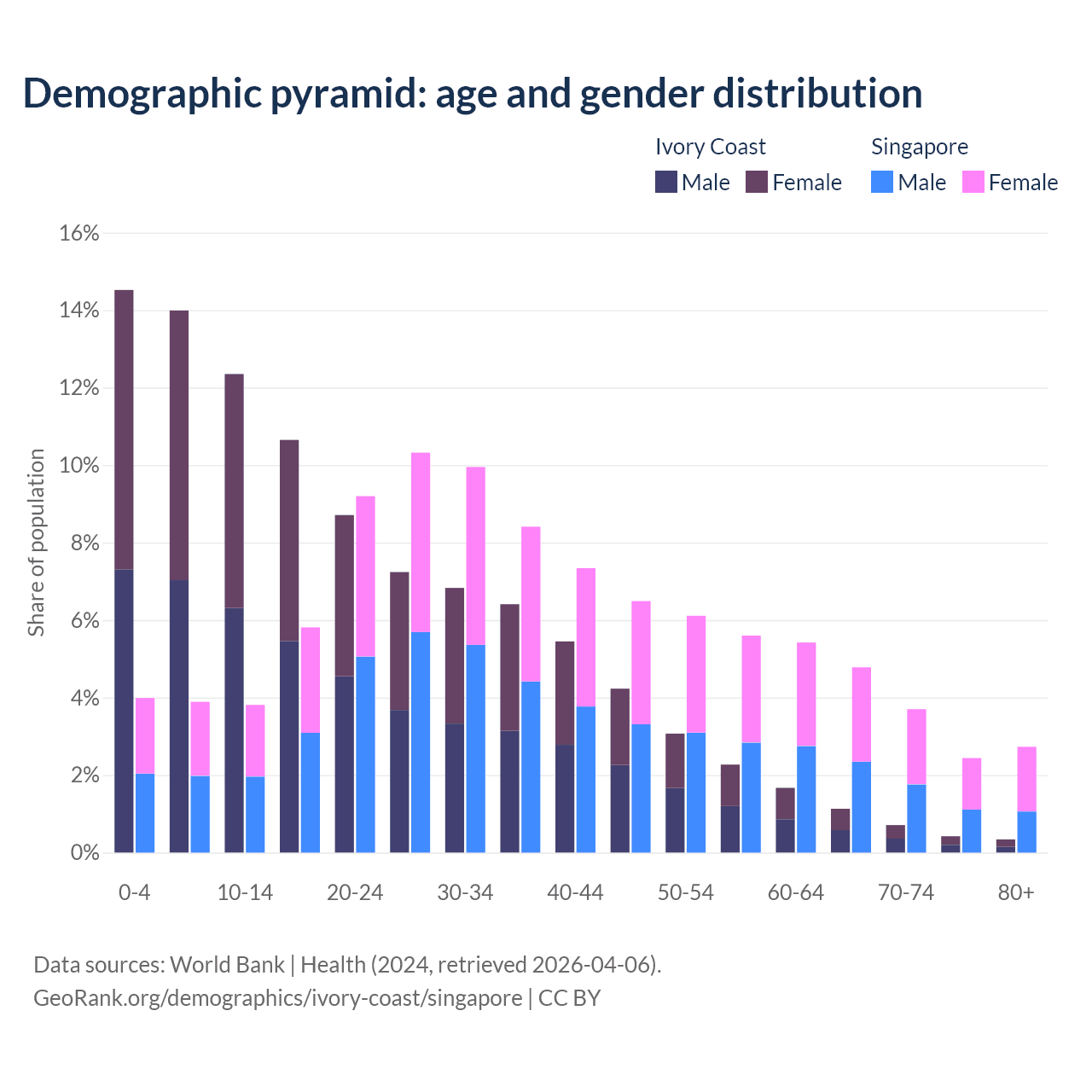 - As of 2026, the population of Ivory Coast is 33.7M vs 6.13M in Singapore - 5.5 times difference.