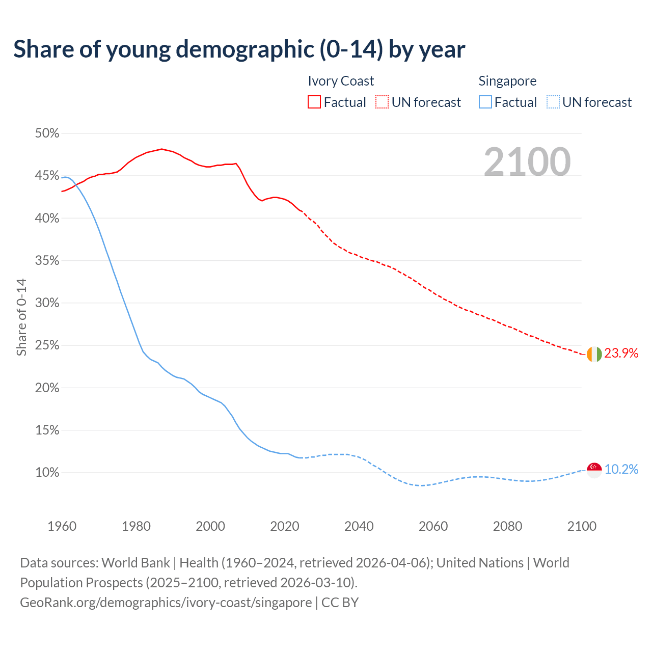 - The share of young demographic (0-15 years old) in Ivory Coast is 40.9% vs 11.7% in Singapore.