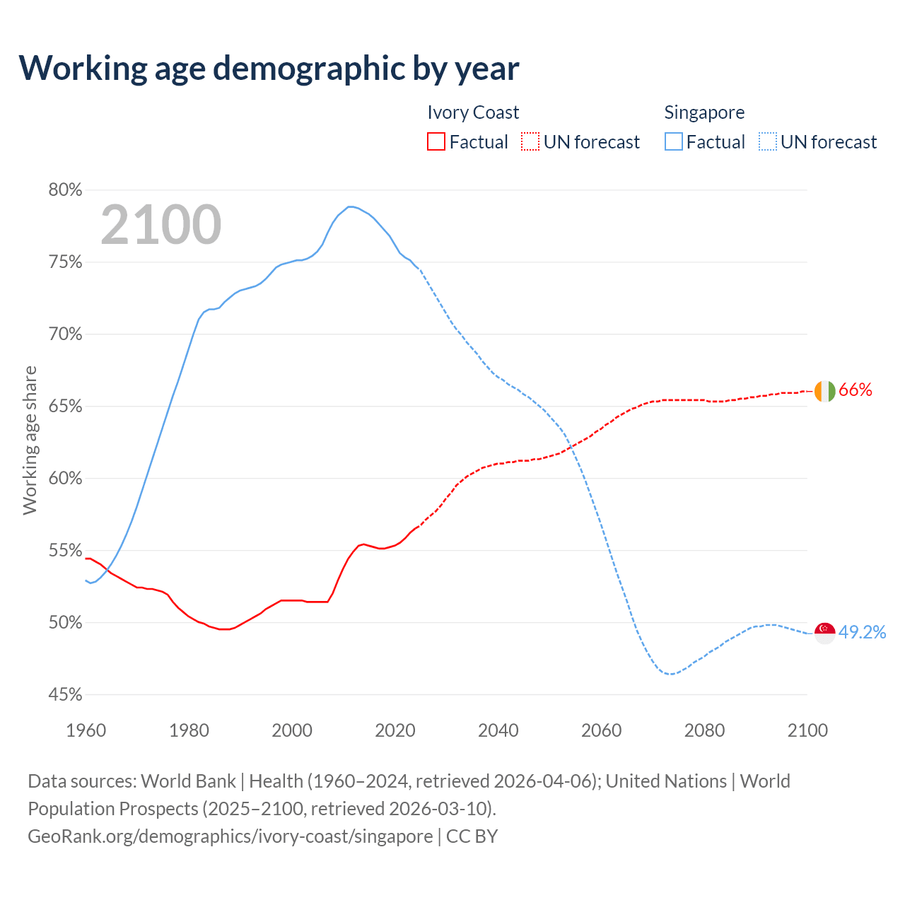 - Ivory Coast has 19.1M working age adults (aged 15-64) vs 4.57M in Singapore.