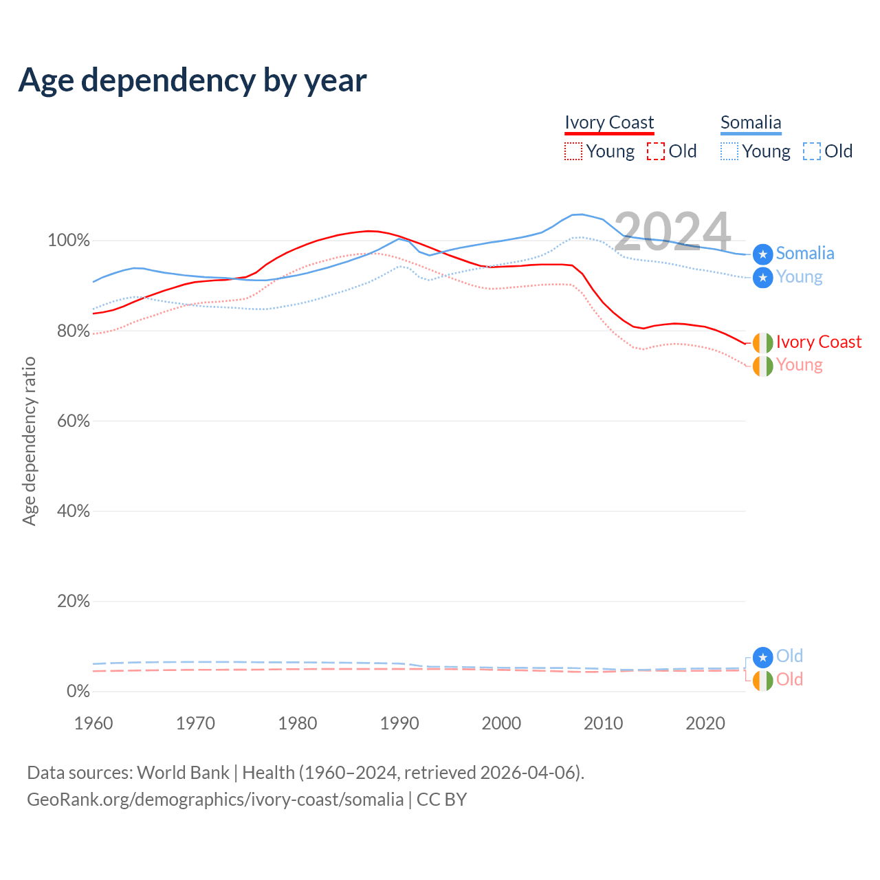 - The share of old-age demographic (65+) in Ivory Coast is 2.61% vs 2.59% in Somalia.