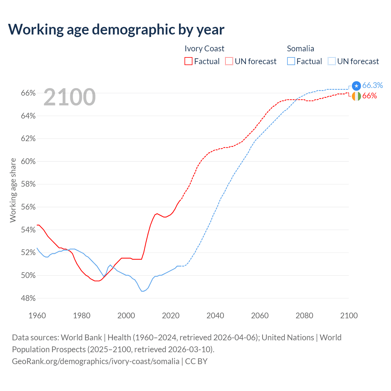 - Ivory Coast has 19.1M working age adults (aged 15-64) vs 10.4M in Somalia.