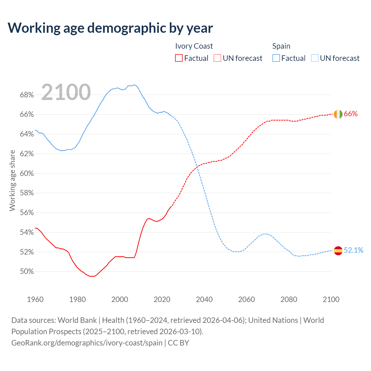 - Ivory Coast has 19.1M working age adults (aged 15-64) vs 32.2M in Spain.