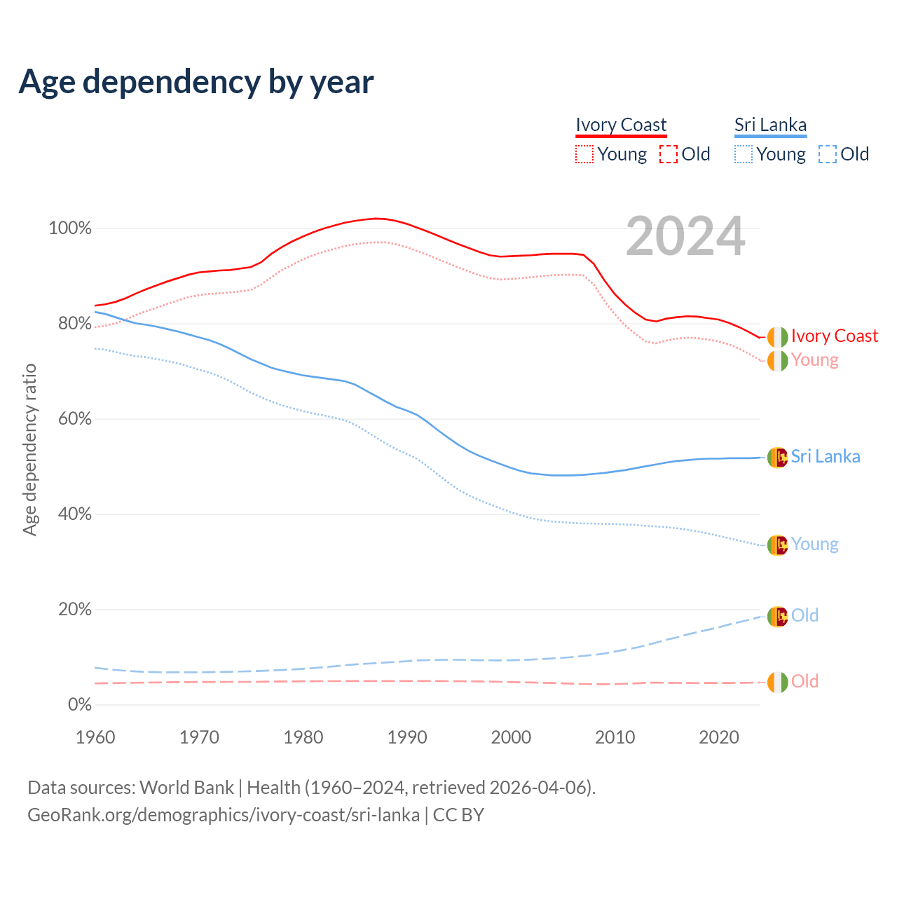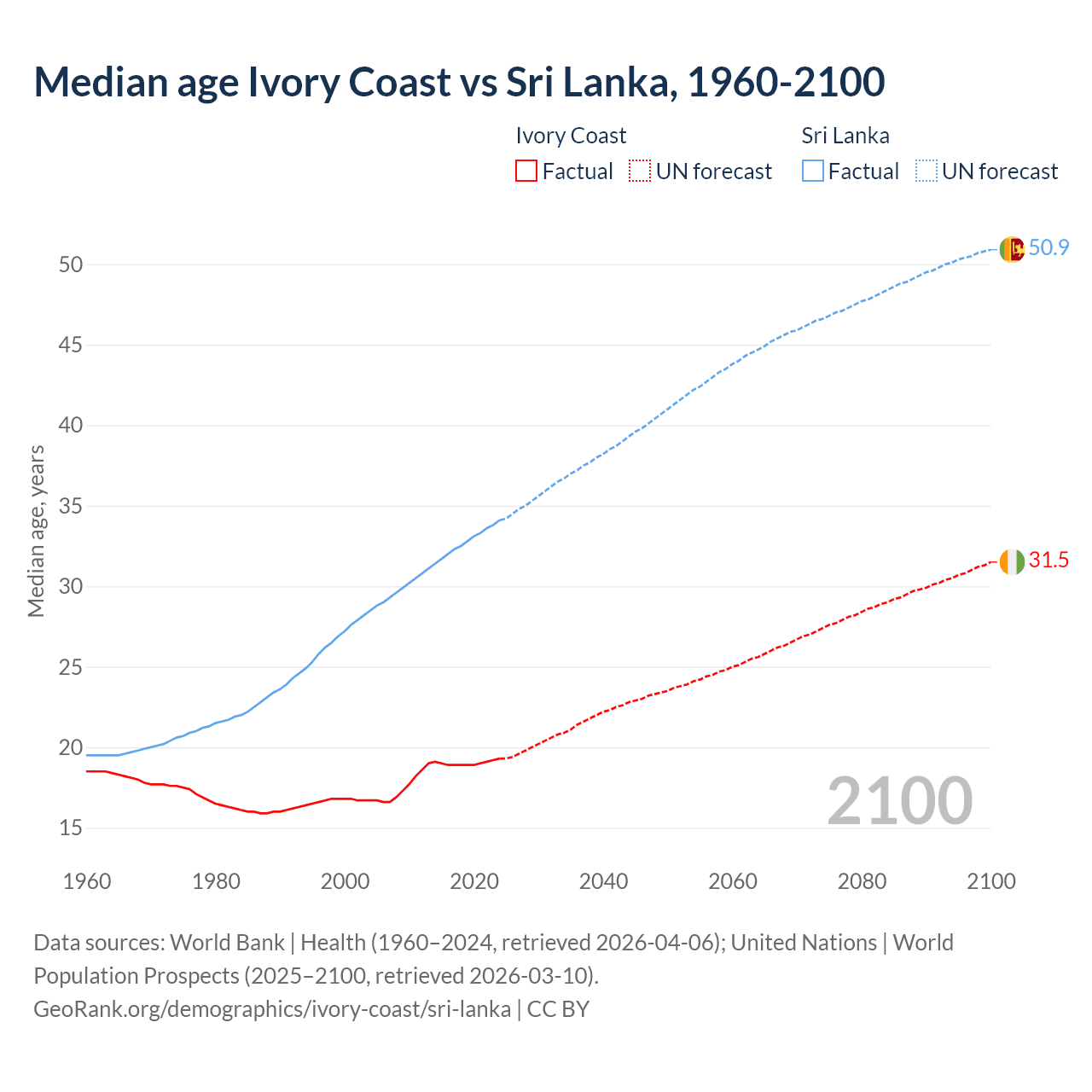 - Ivory Coast is ranked 175/196 by median age (oldest to youngest) vs 81/196 for Sri Lanka.
