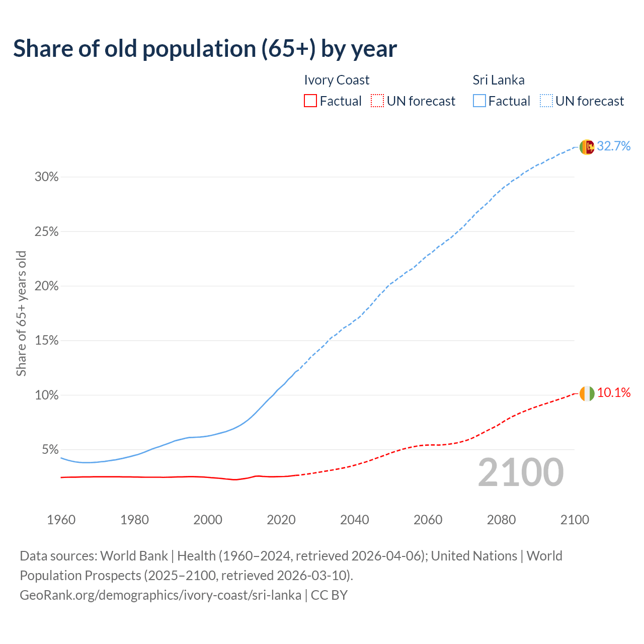 The share of older people aged 65 and over is 2.61% in Ivory Coast and 12.1% in Sri Lanka. Life expectancy in Ivory Coast compared to Sri Lanka .