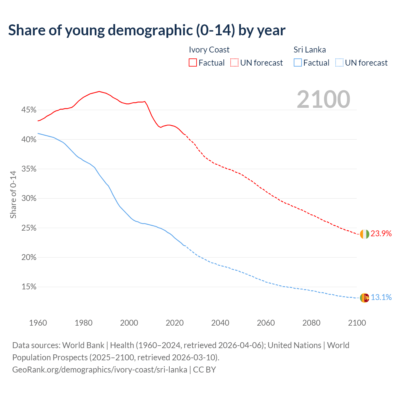 - The share of young demographic (0-15 years old) in Ivory Coast is 40.9% vs 22% in Sri Lanka.