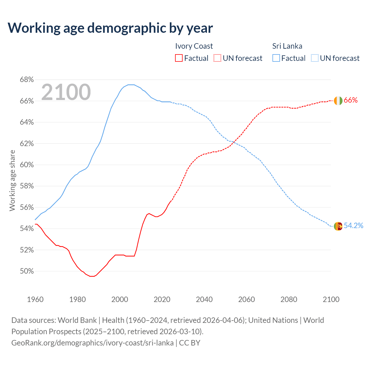 - Ivory Coast has 19.1M working age adults (aged 15-64) vs 14.6M in Sri Lanka.