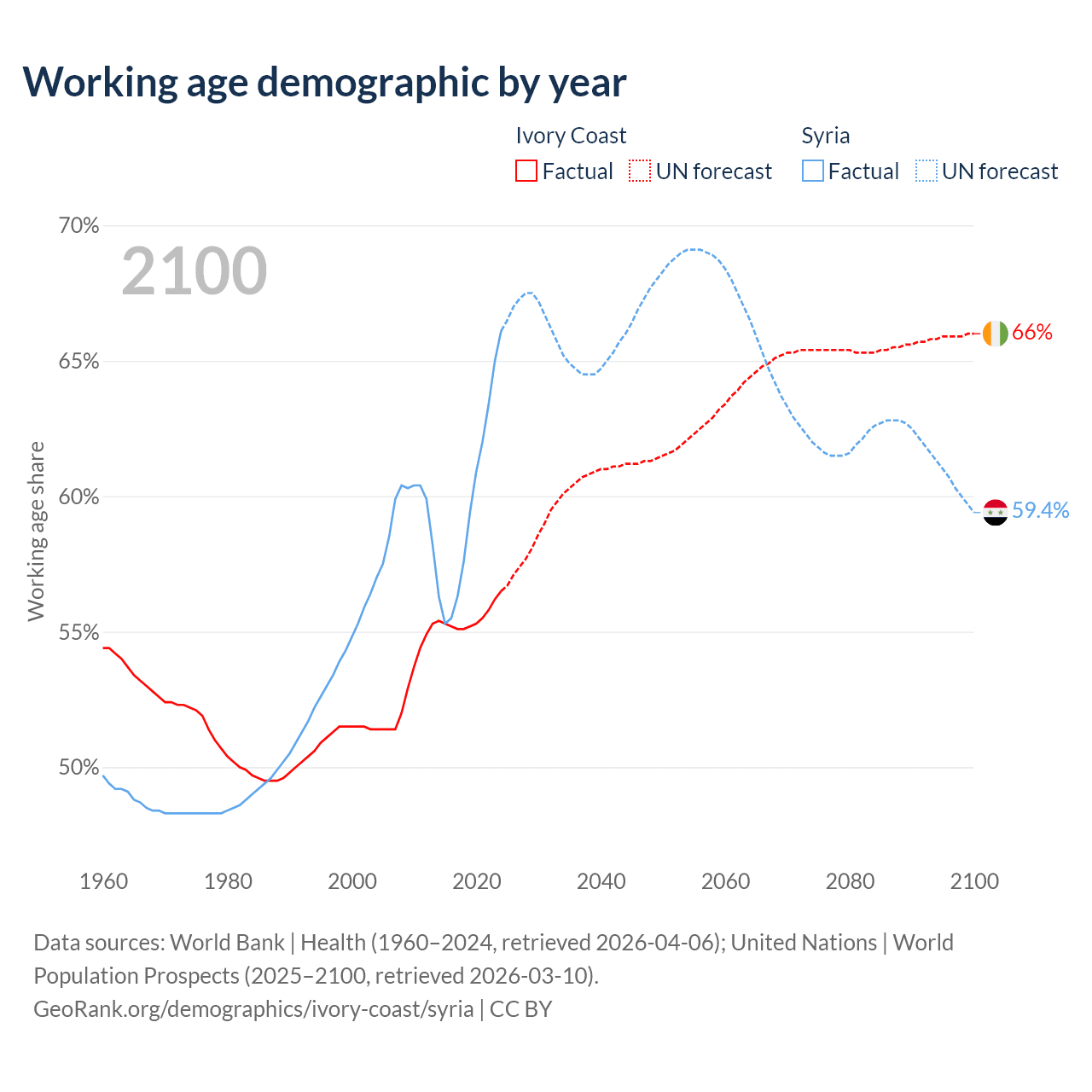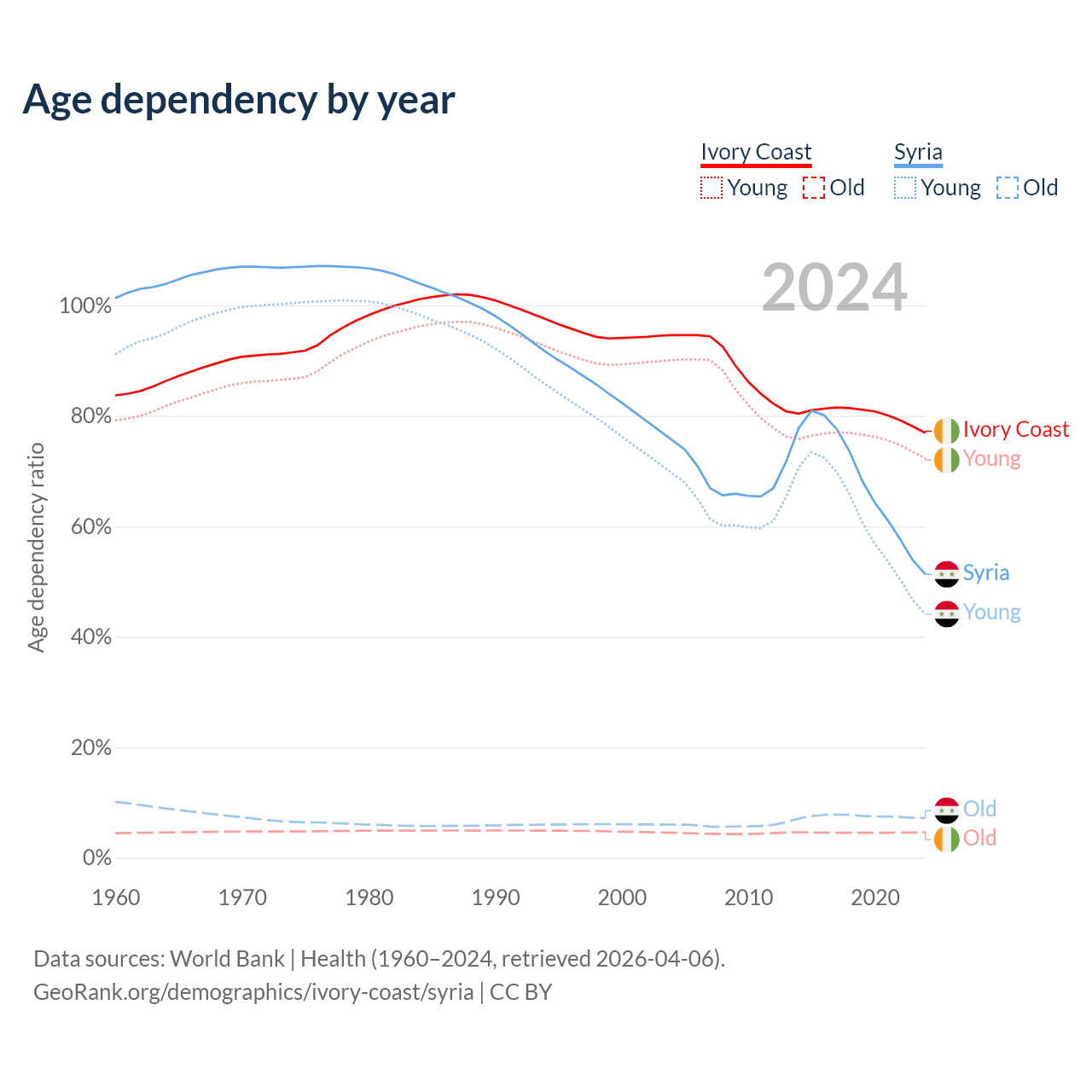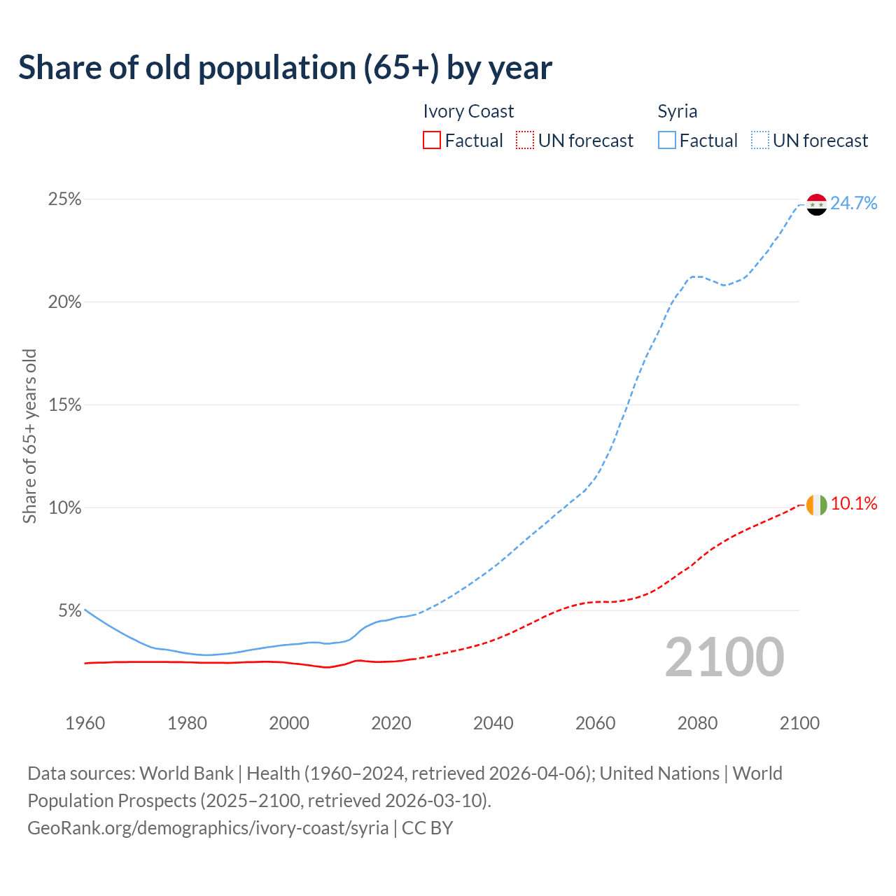 - The share of old-age demographic (65+) in Ivory Coast is 2.61% vs 4.74% in Syria.