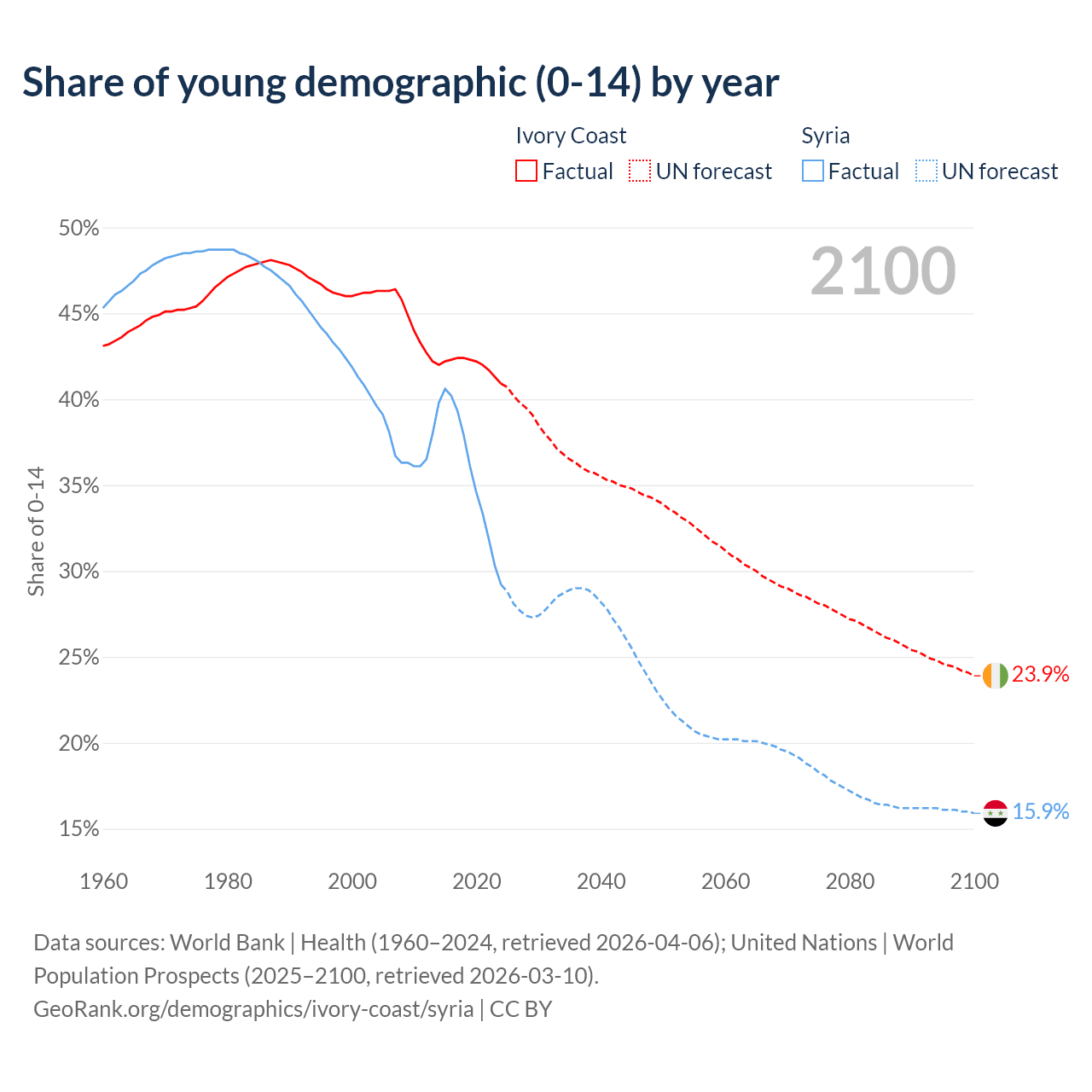 - The share of young demographic (0-15 years old) in Ivory Coast is 40.9% vs 29.2% in Syria.