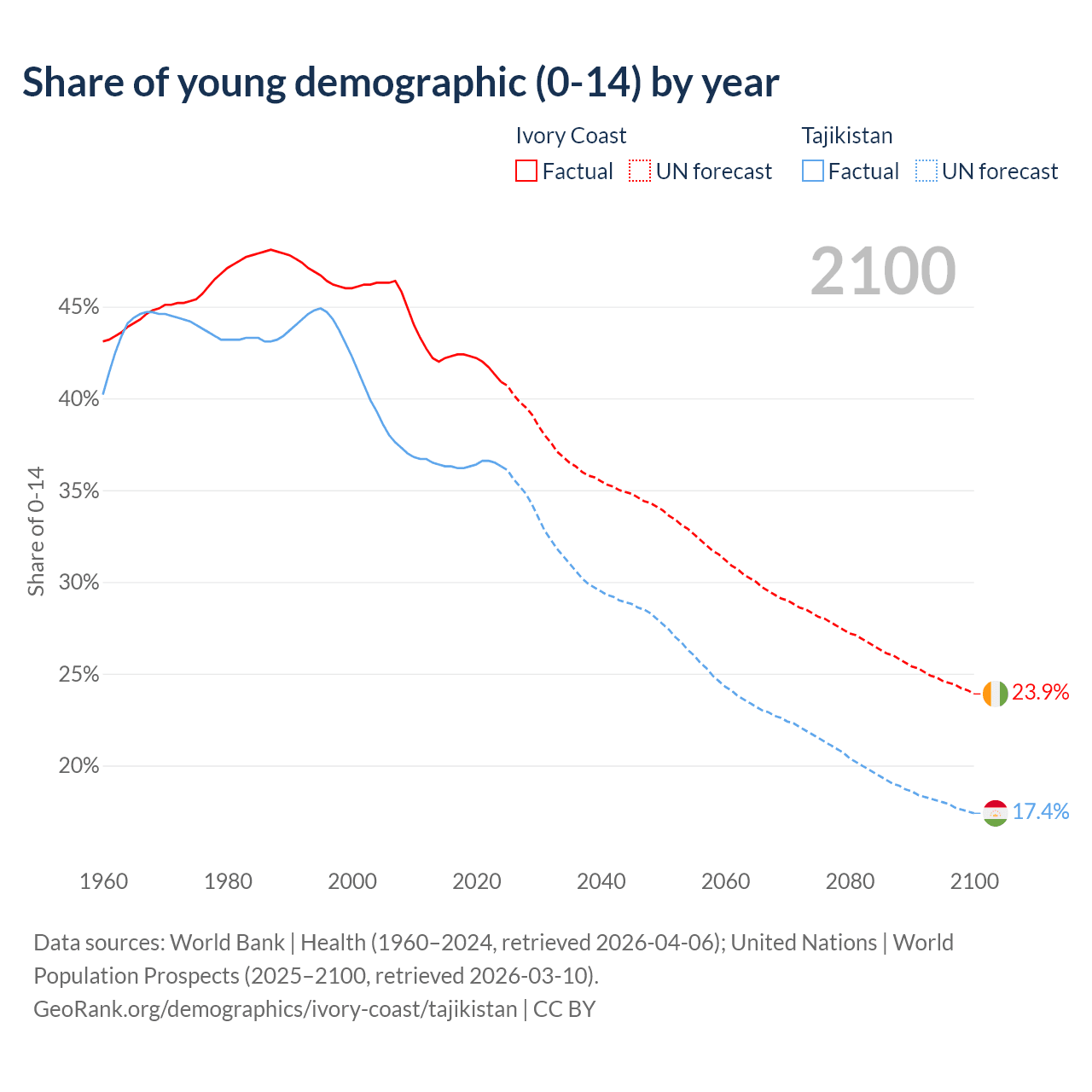 - The share of young demographic (0-15 years old) in Ivory Coast is 40.9% vs 36.3% in Tajikistan.