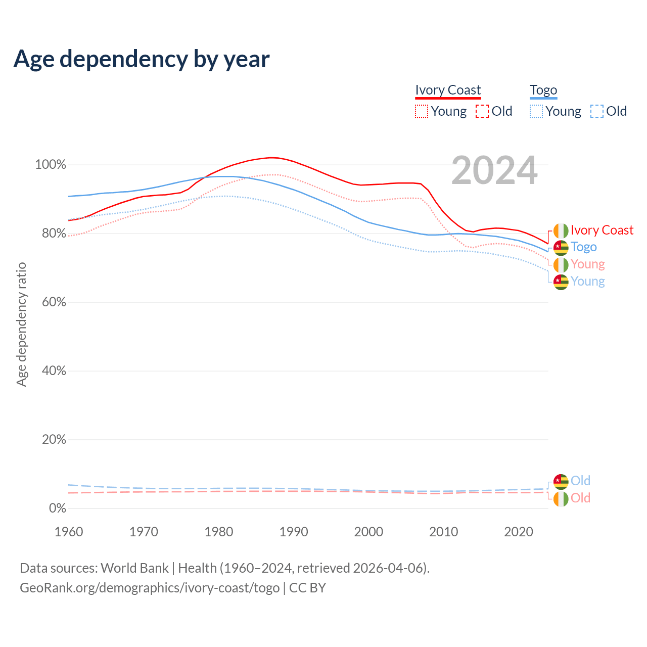 - Ivory Coast is ranked 175/196 by median age (oldest to youngest) vs 166/196 for Togo.