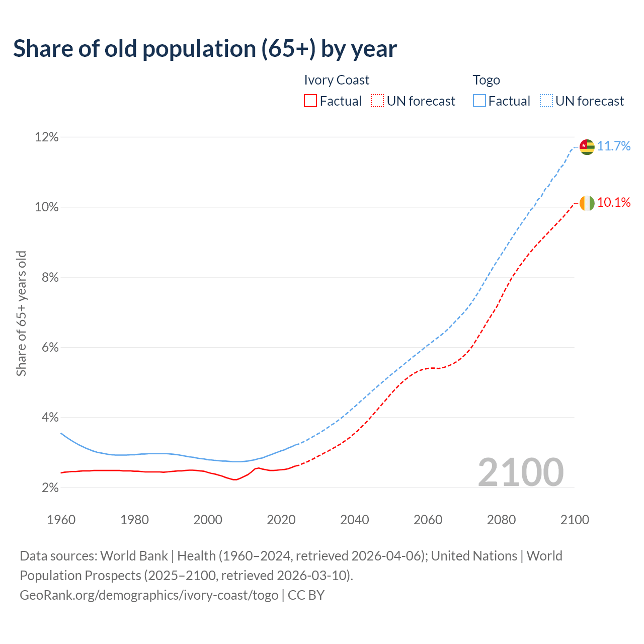 The share of older people aged 65 and over is 2.61% in Ivory Coast and 3.21% in Togo. Life expectancy in Ivory Coast compared to Togo .