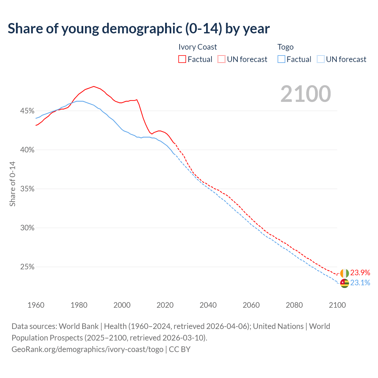- The share of young demographic (0-15 years old) in Ivory Coast is 40.9% vs 39.5% in Togo.