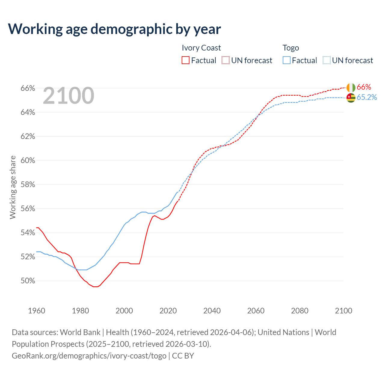 - Ivory Coast has 19.1M working age adults (aged 15-64) vs 5.72M in Togo.