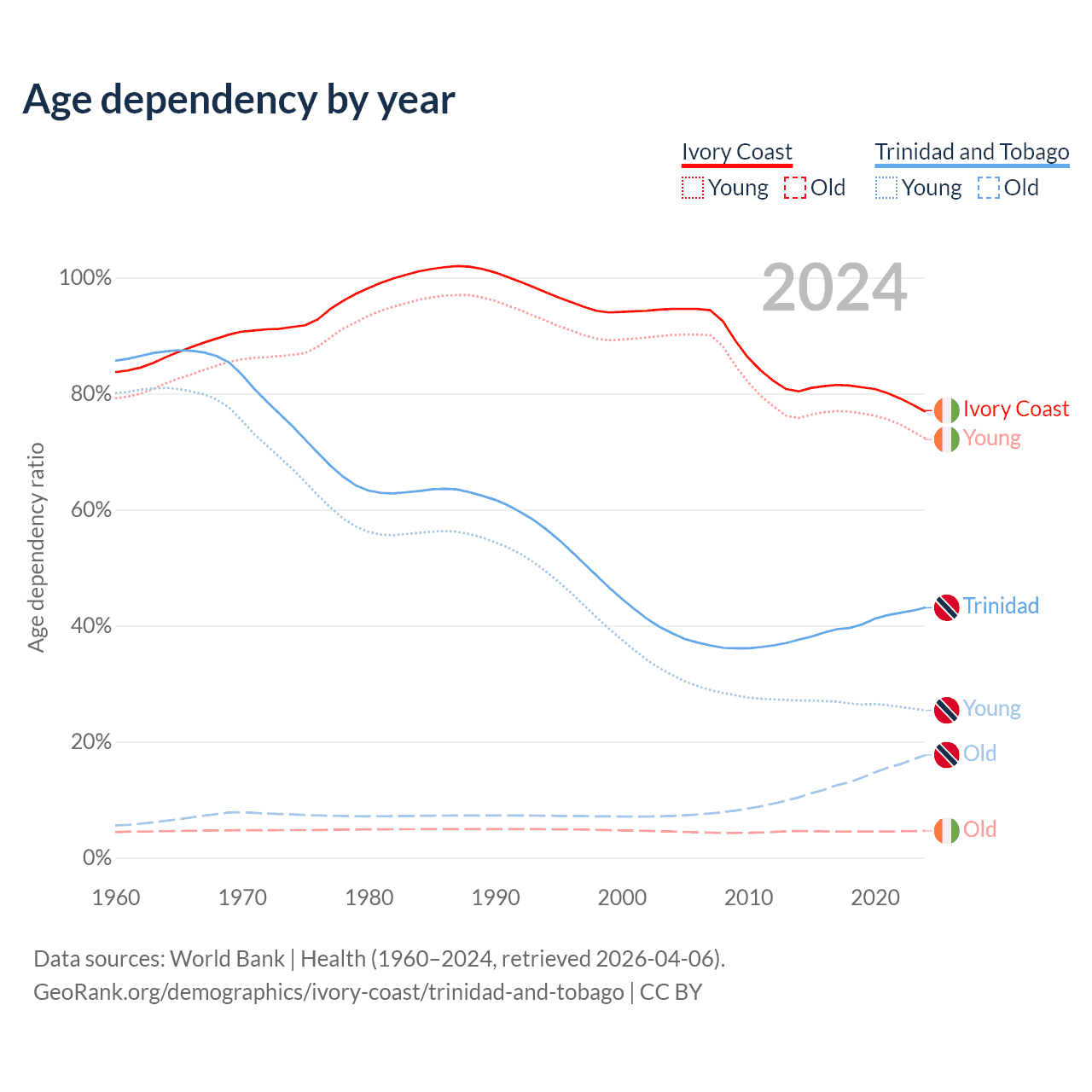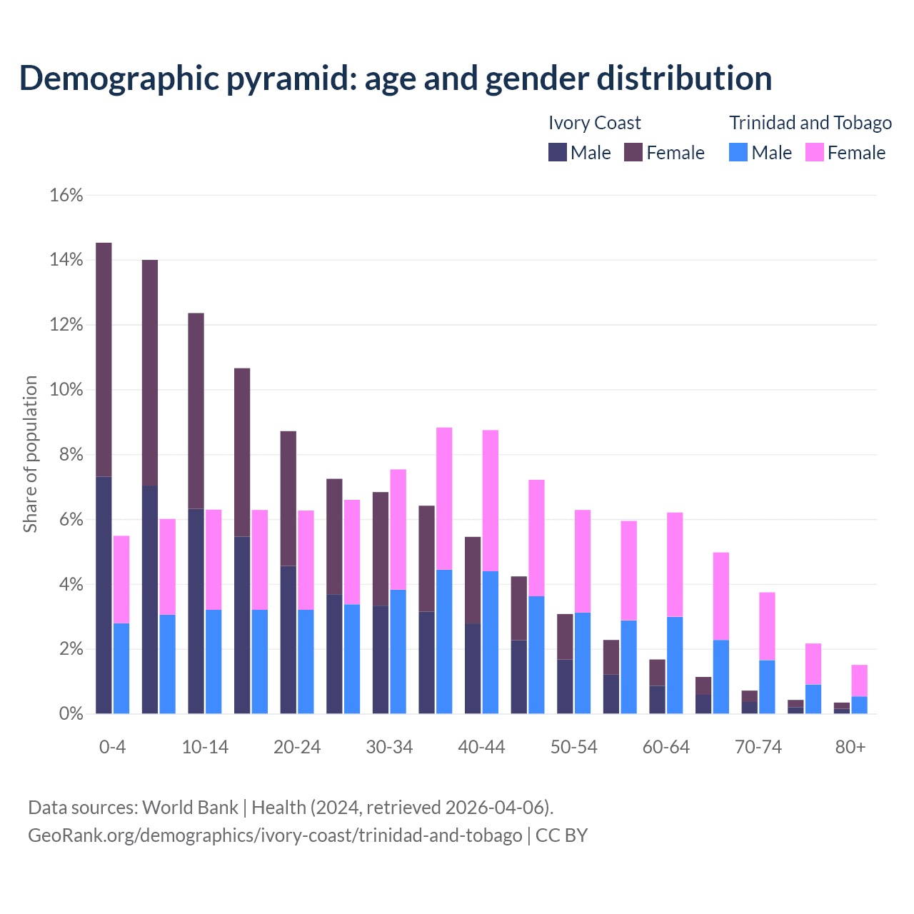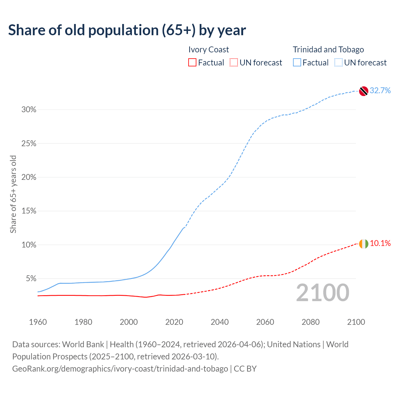 The share of older people aged 65 and over is 2.61% in Ivory Coast and 12.4% in Trinidad and Tobago. Life expectancy in Ivory Coast compared to Trinidad and Tobago .