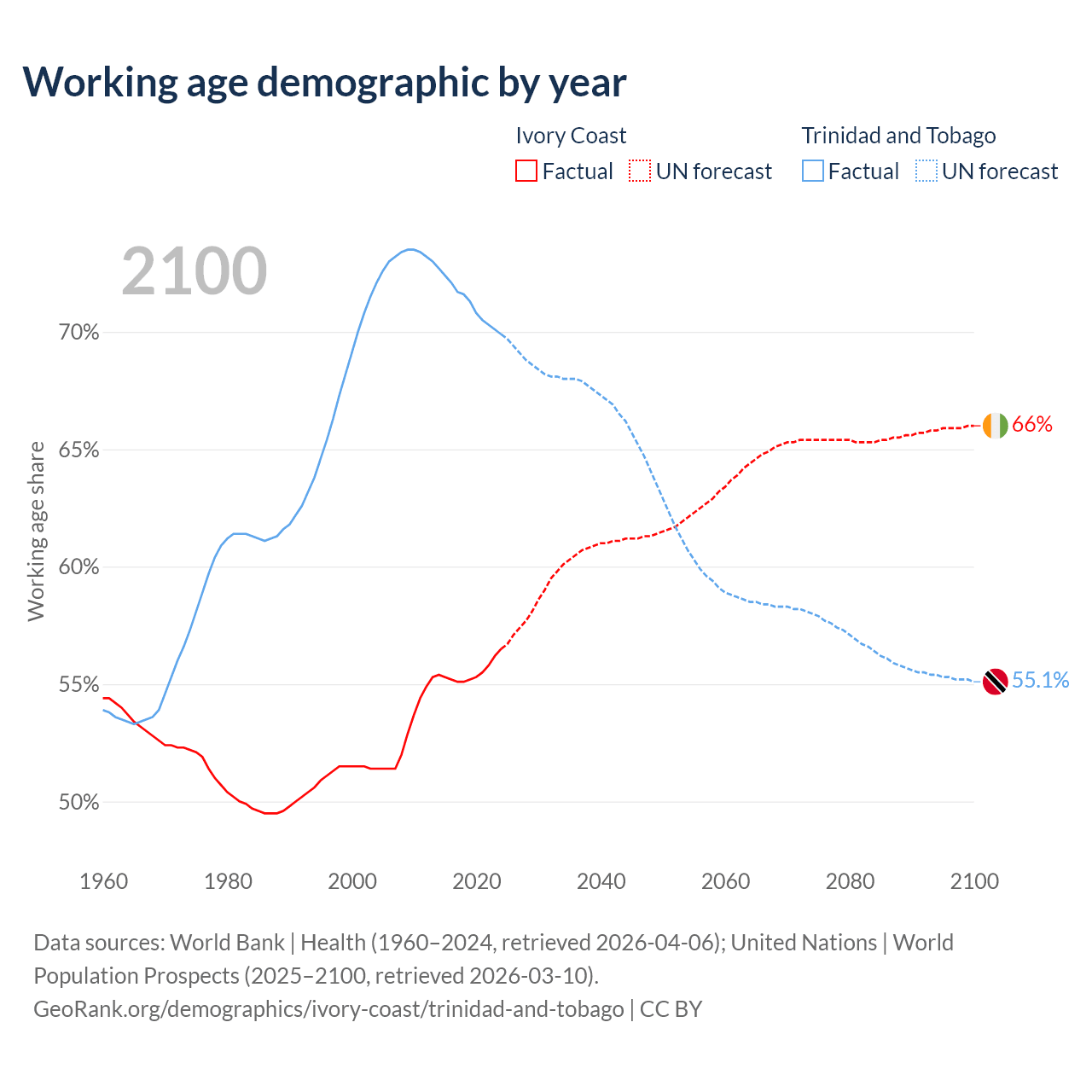 Median age Ivory Coast vs Trinidad and Tobago, 1960-2100