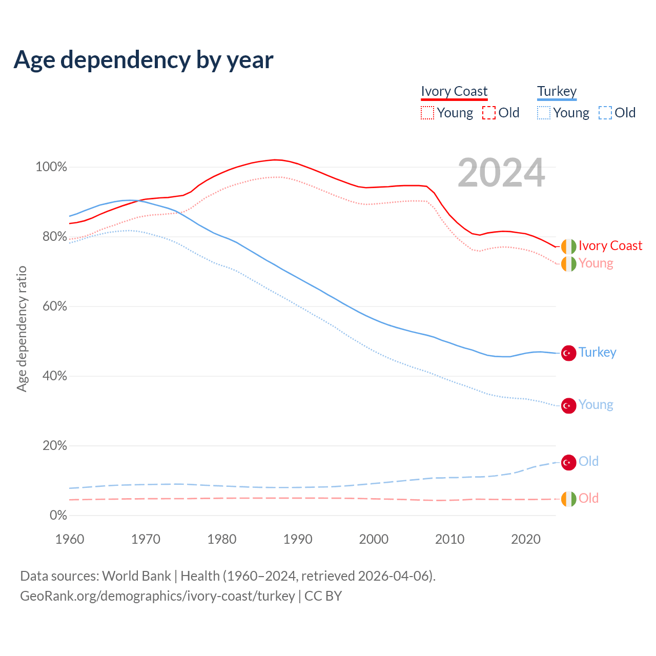 - Ivory Coast is ranked 175/196 by median age (oldest to youngest) vs 83/196 for Turkey.