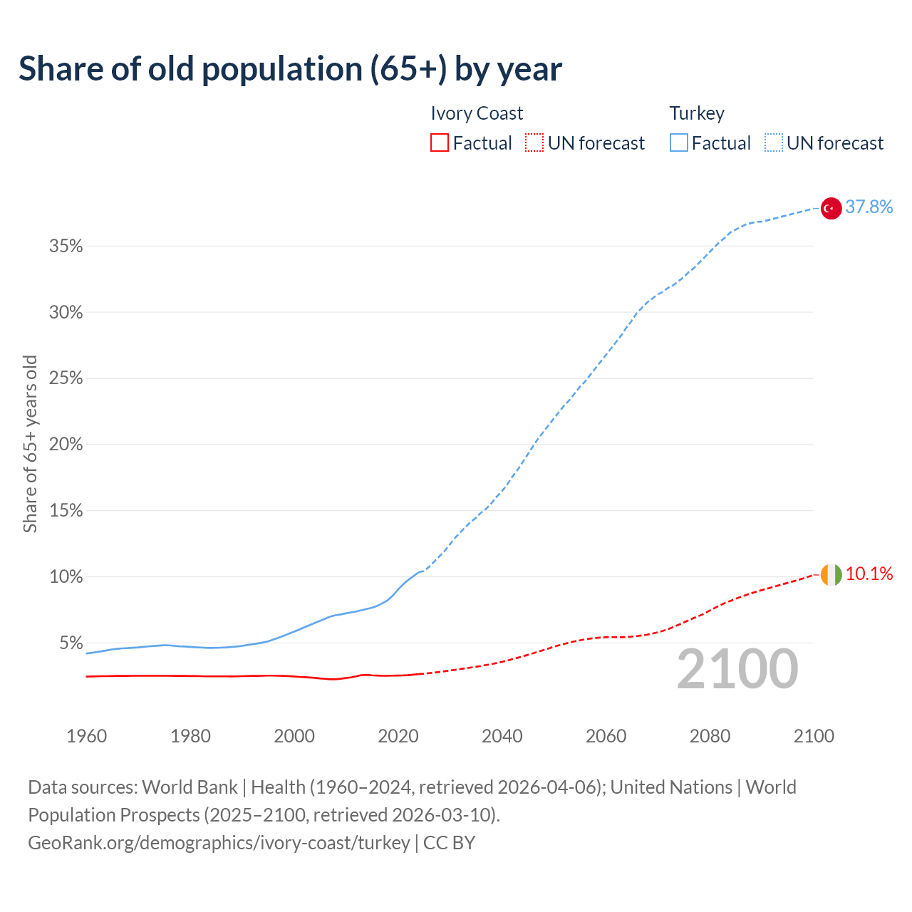 The share of older people aged 65 and over is 2.61% in Ivory Coast and 10.3% in Turkey. Life expectancy in Ivory Coast compared to Turkey .