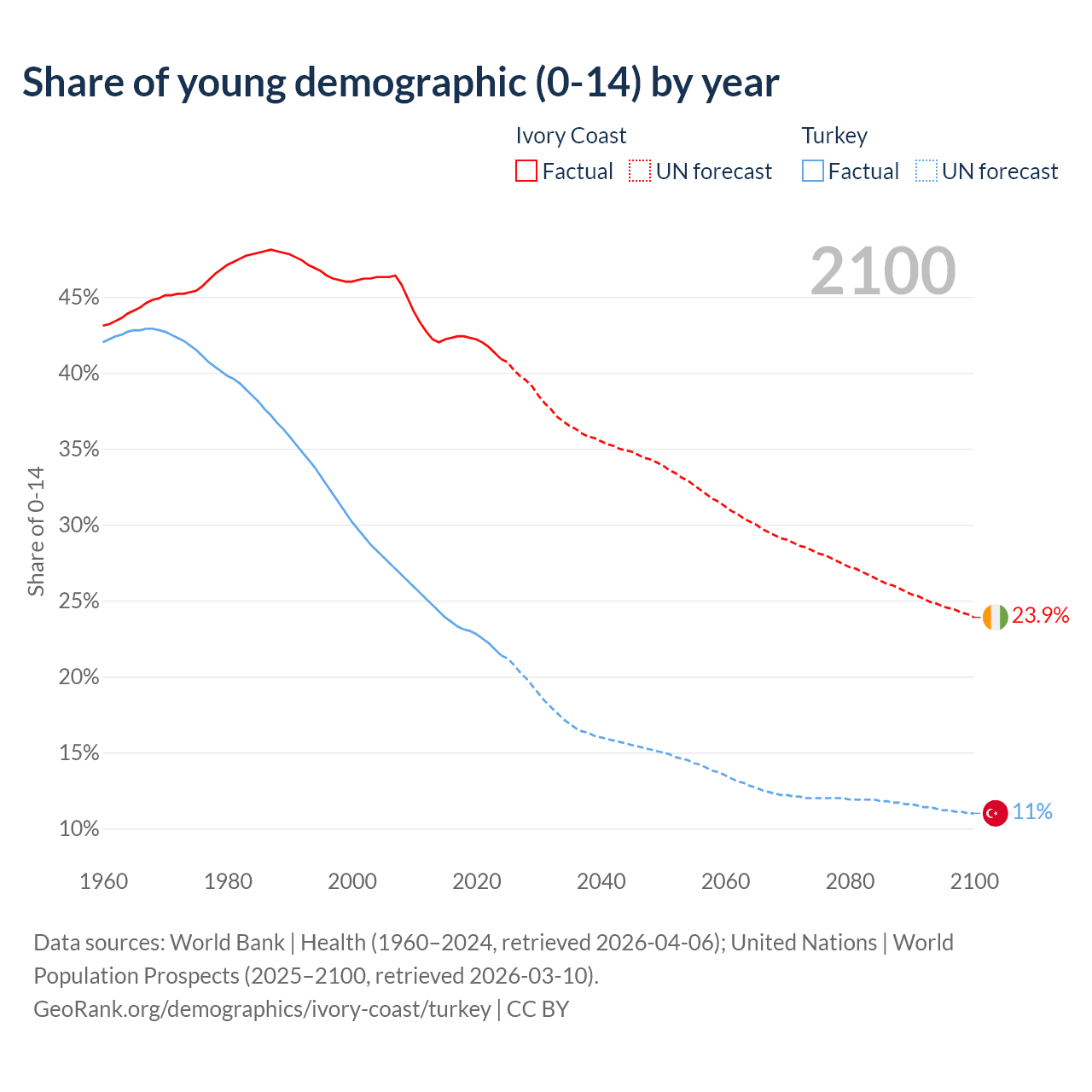 - The share of young demographic (0-15 years old) in Ivory Coast is 40.9% vs 21.4% in Turkey.