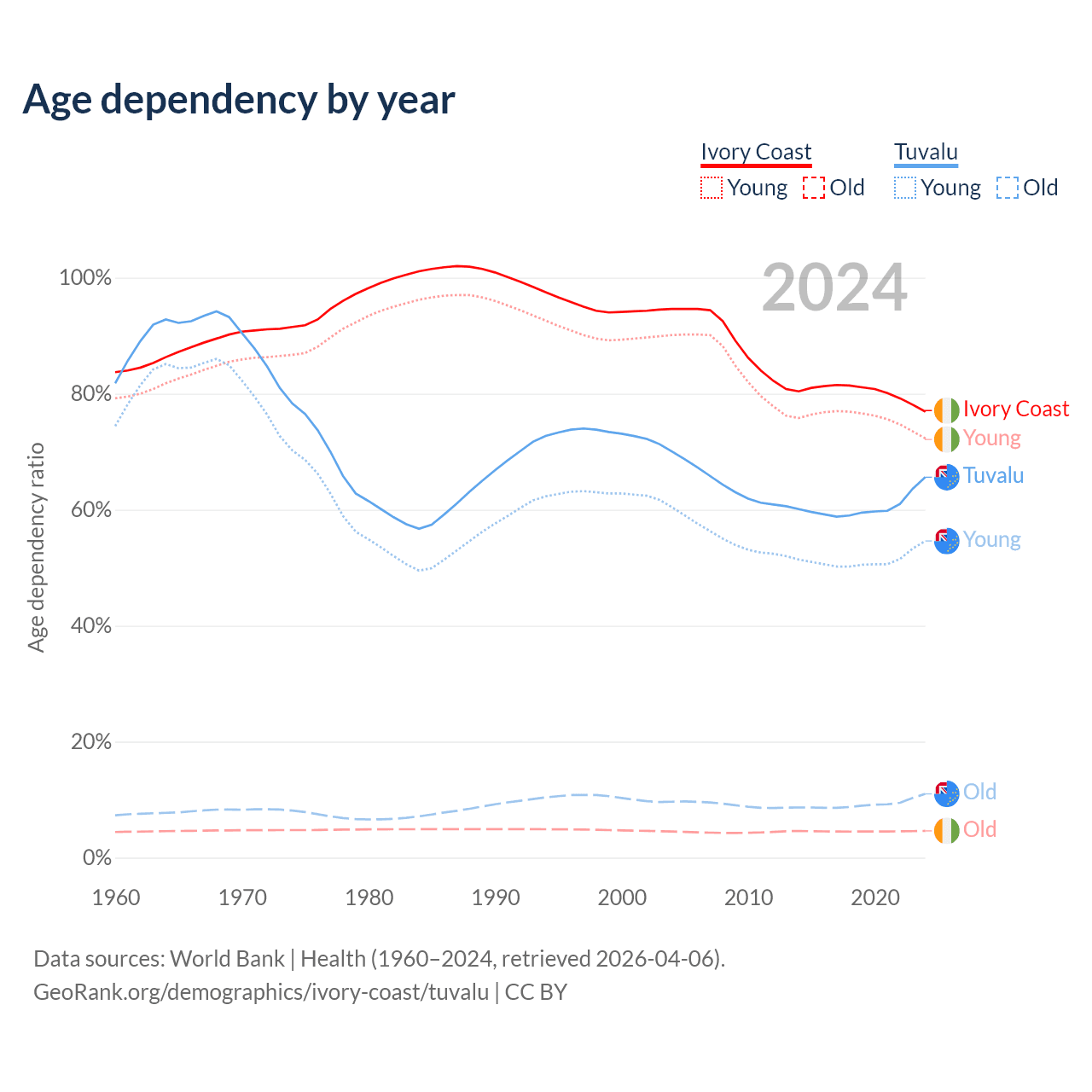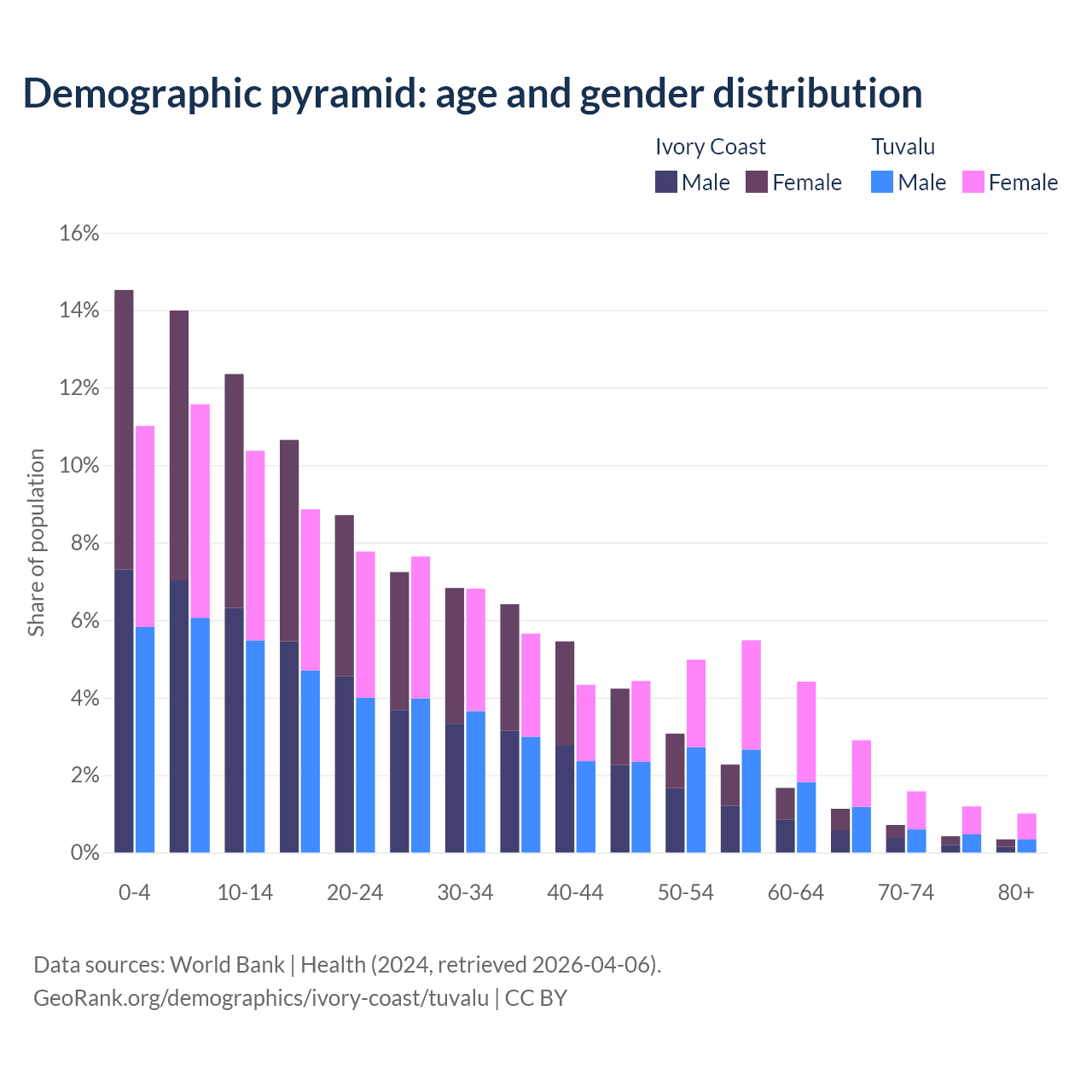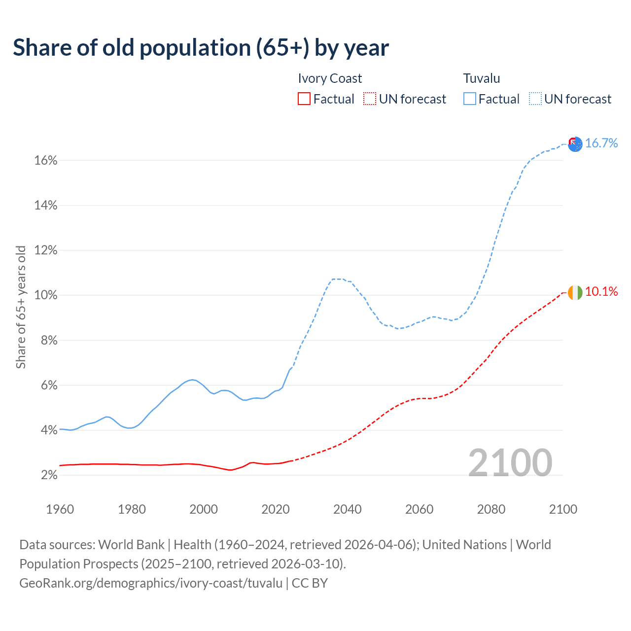 - The share of old-age demographic (65+) in Ivory Coast is 2.61% vs 6.67% in Tuvalu.