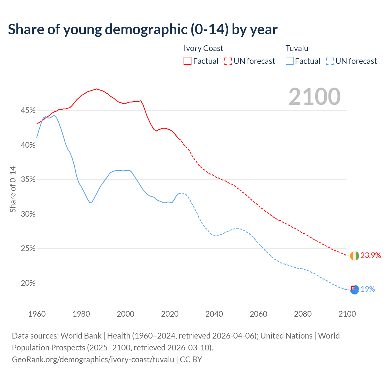 - The share of young demographic (0-15 years old) in Ivory Coast is 40.9% vs 32.9% in Tuvalu.