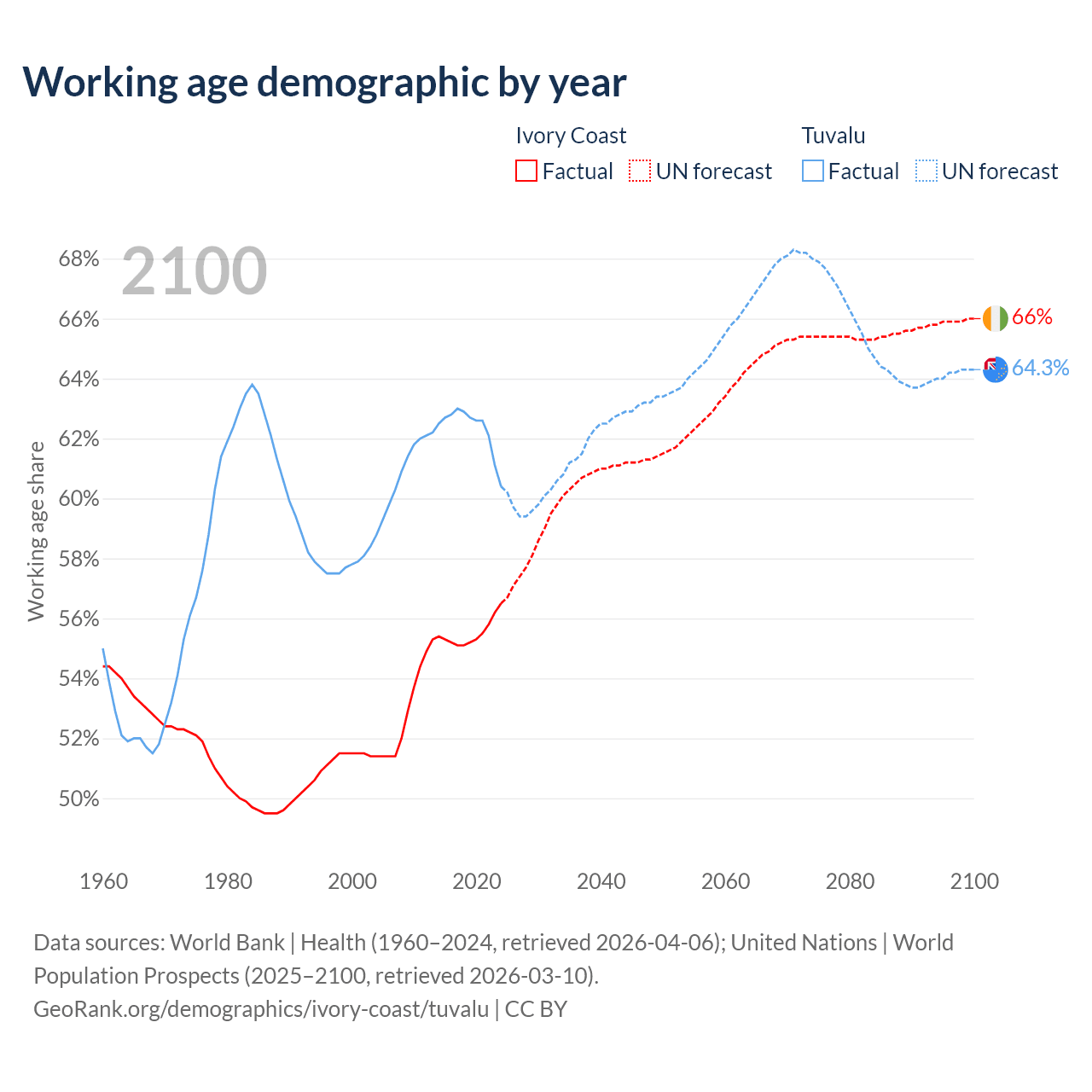 - Ivory Coast has 19.1M working age adults (aged 15-64) vs 5.64K in Tuvalu.