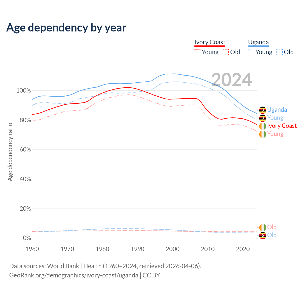 - Ivory Coast is ranked 175/196 by median age (oldest to youngest) vs 187/196 for Uganda.