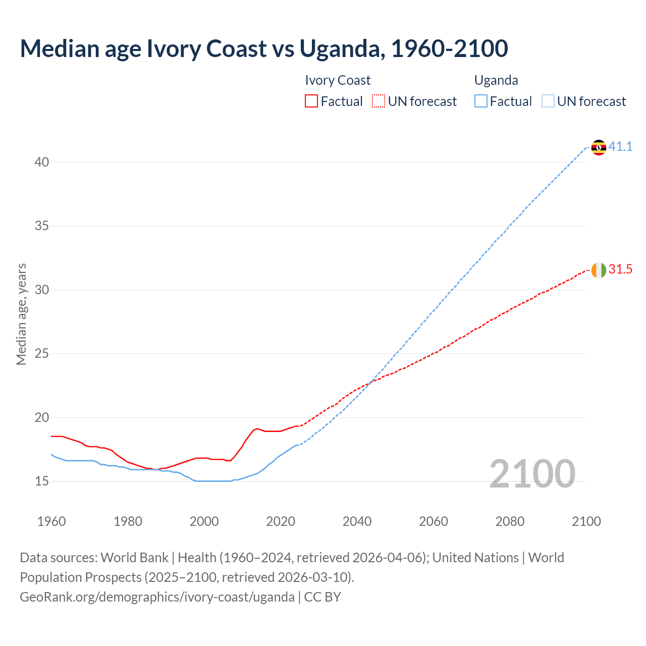 Median age Ivory Coast vs Uganda, 1960-2100