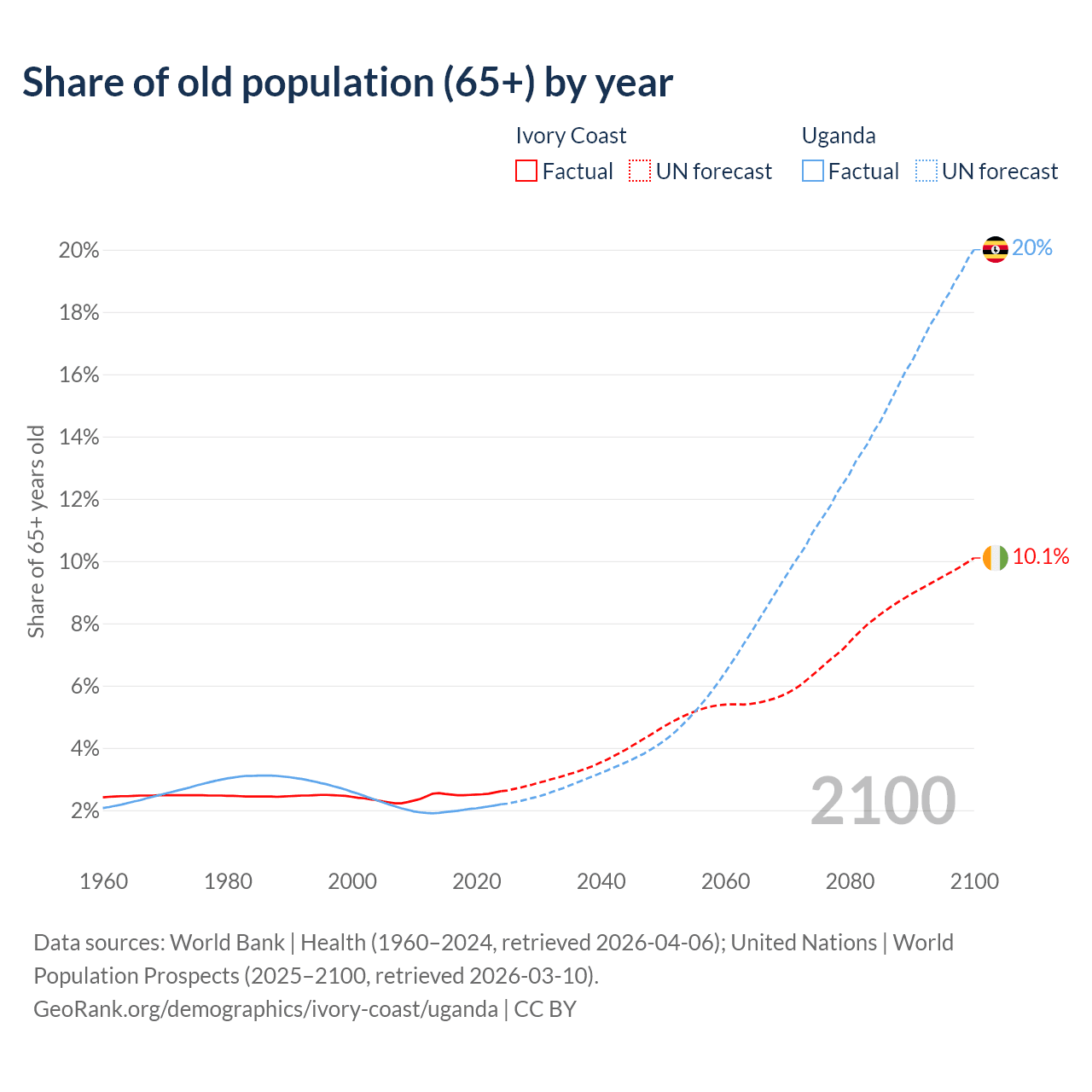 - The share of old-age demographic (65+) in Ivory Coast is 2.61% vs 2.19% in Uganda.