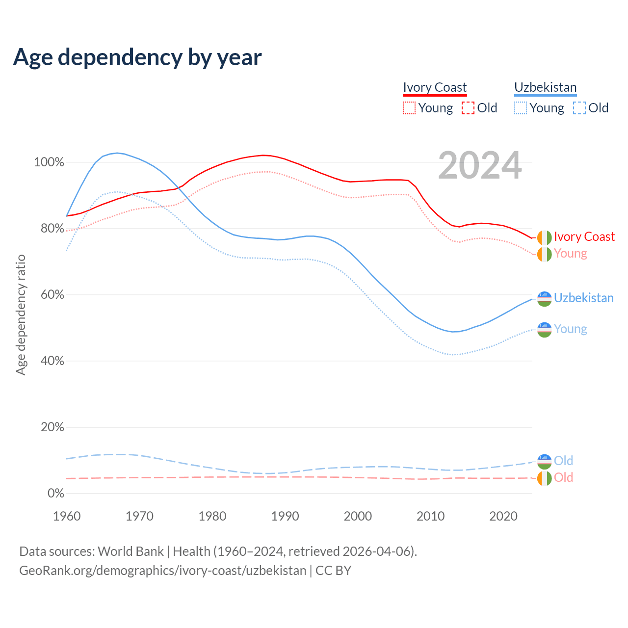 - Ivory Coast is ranked 175/196 by median age (oldest to youngest) vs 116/196 for Uzbekistan.