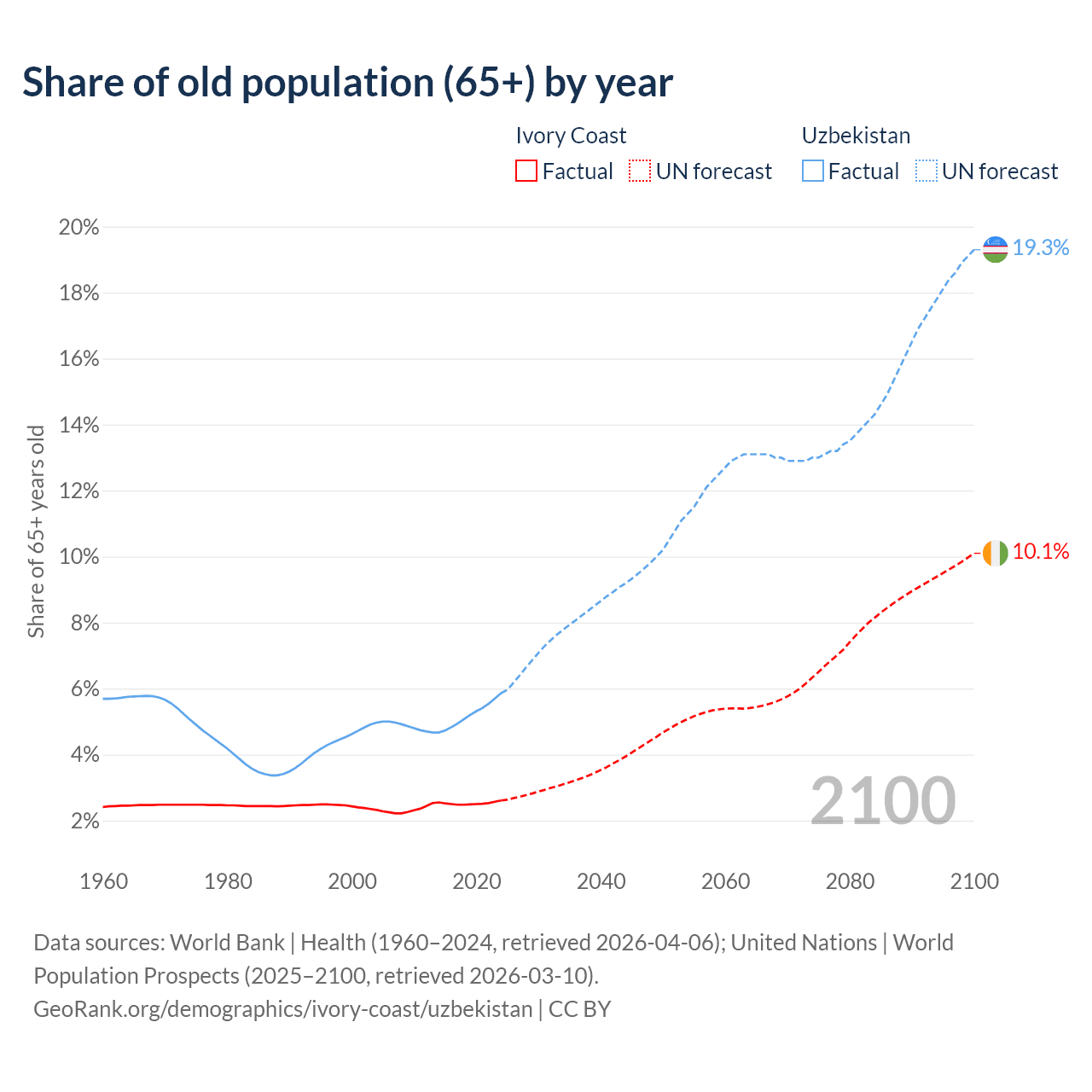 The share of older people aged 65 and over is 2.61% in Ivory Coast and 5.86% in Uzbekistan. Life expectancy in Ivory Coast compared to Uzbekistan .