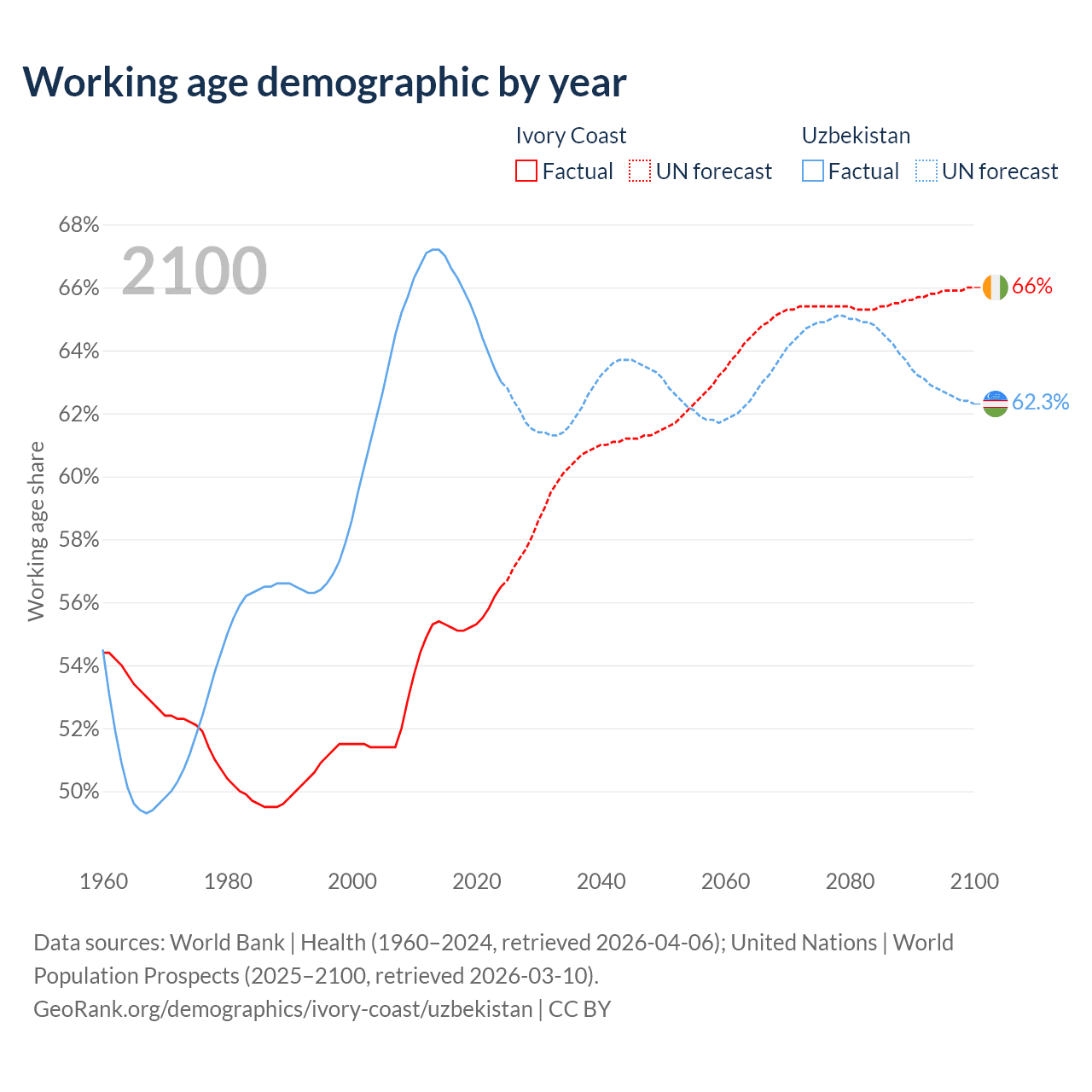 - Ivory Coast has 19.1M working age adults (aged 15-64) vs 23.9M in Uzbekistan.