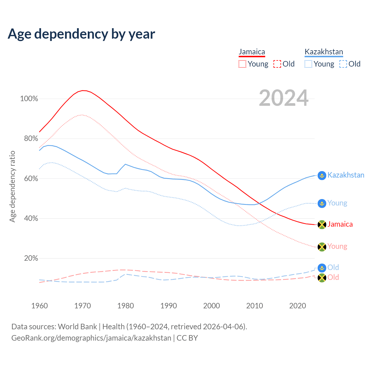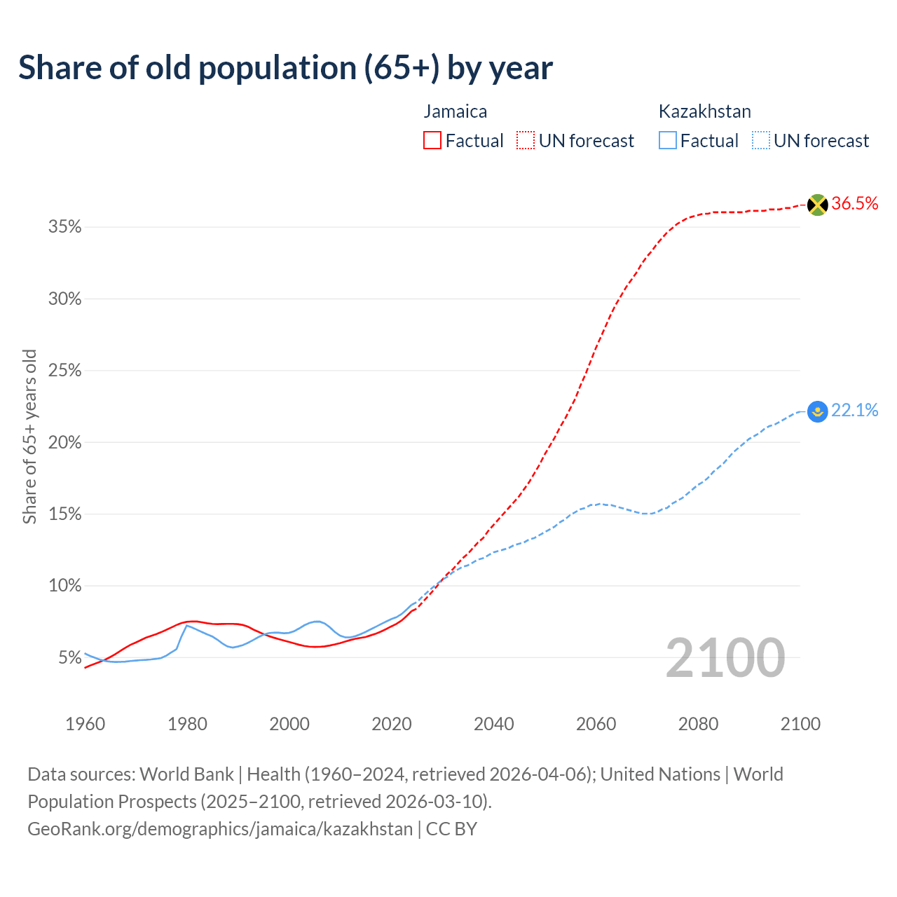 - The share of old-age demographic (65+) in Jamaica is 8.21% vs 8.65% in Kazakhstan.