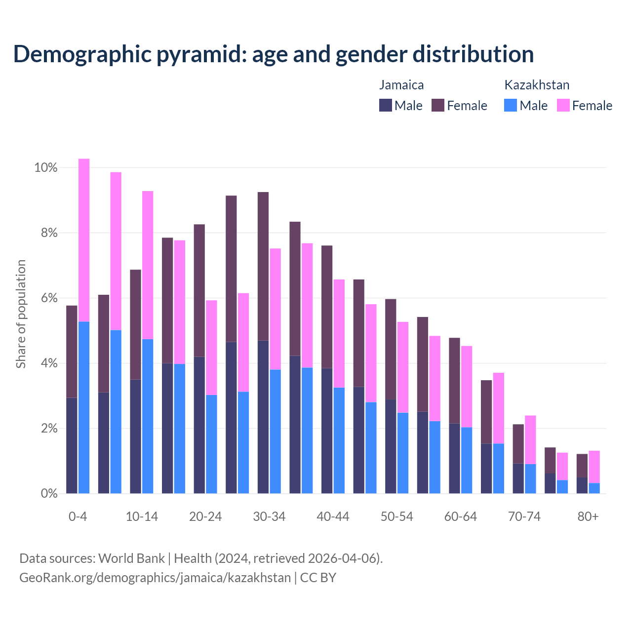 - Jamaica is ranked 87/196 by median age (oldest to youngest) vs 99/196 for Kazakhstan.