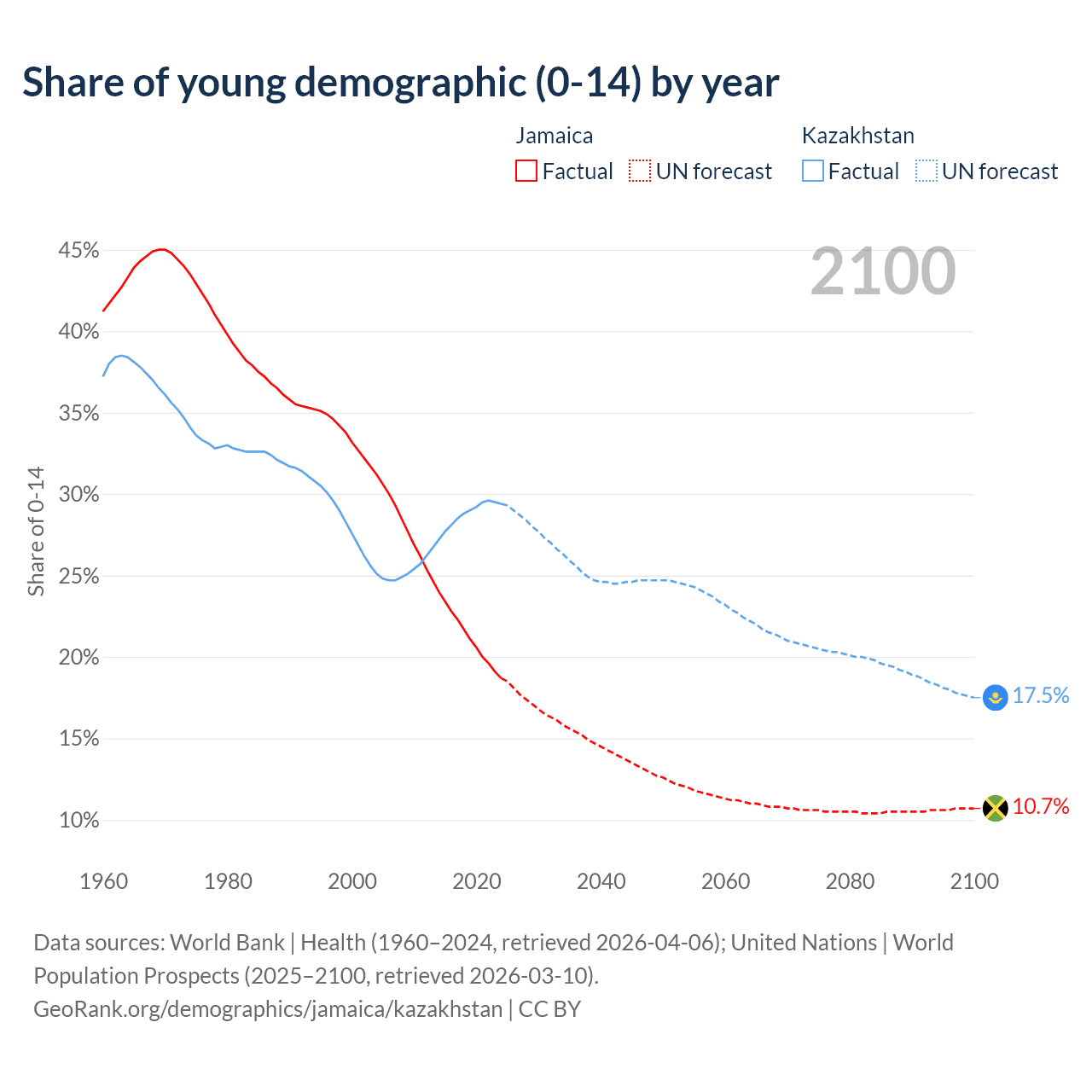- The share of young demographic (0-15 years old) in Jamaica is 18.7% vs 29.4% in Kazakhstan.