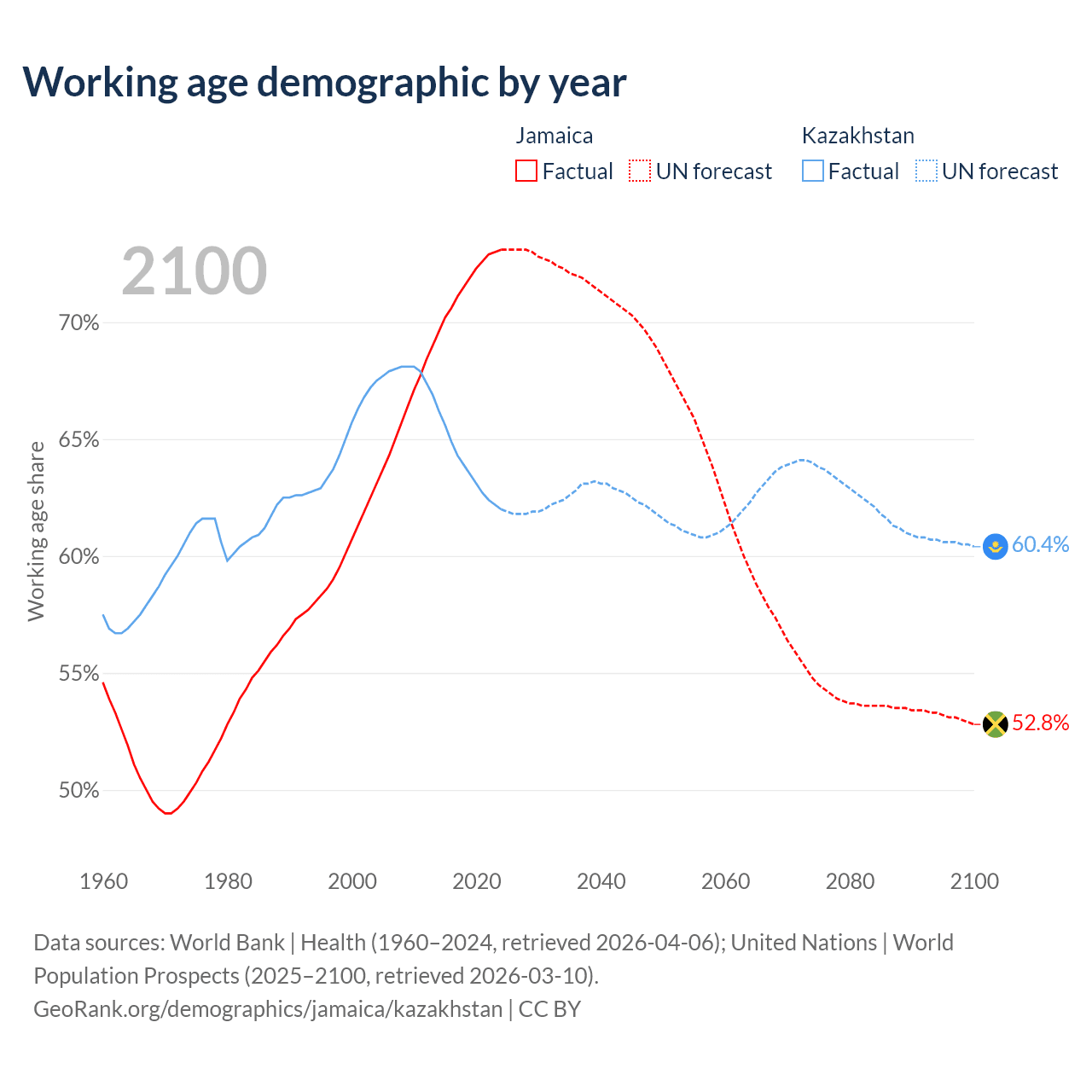 - Jamaica has 2.07M working age adults (aged 15-64) vs 13.1M in Kazakhstan.
