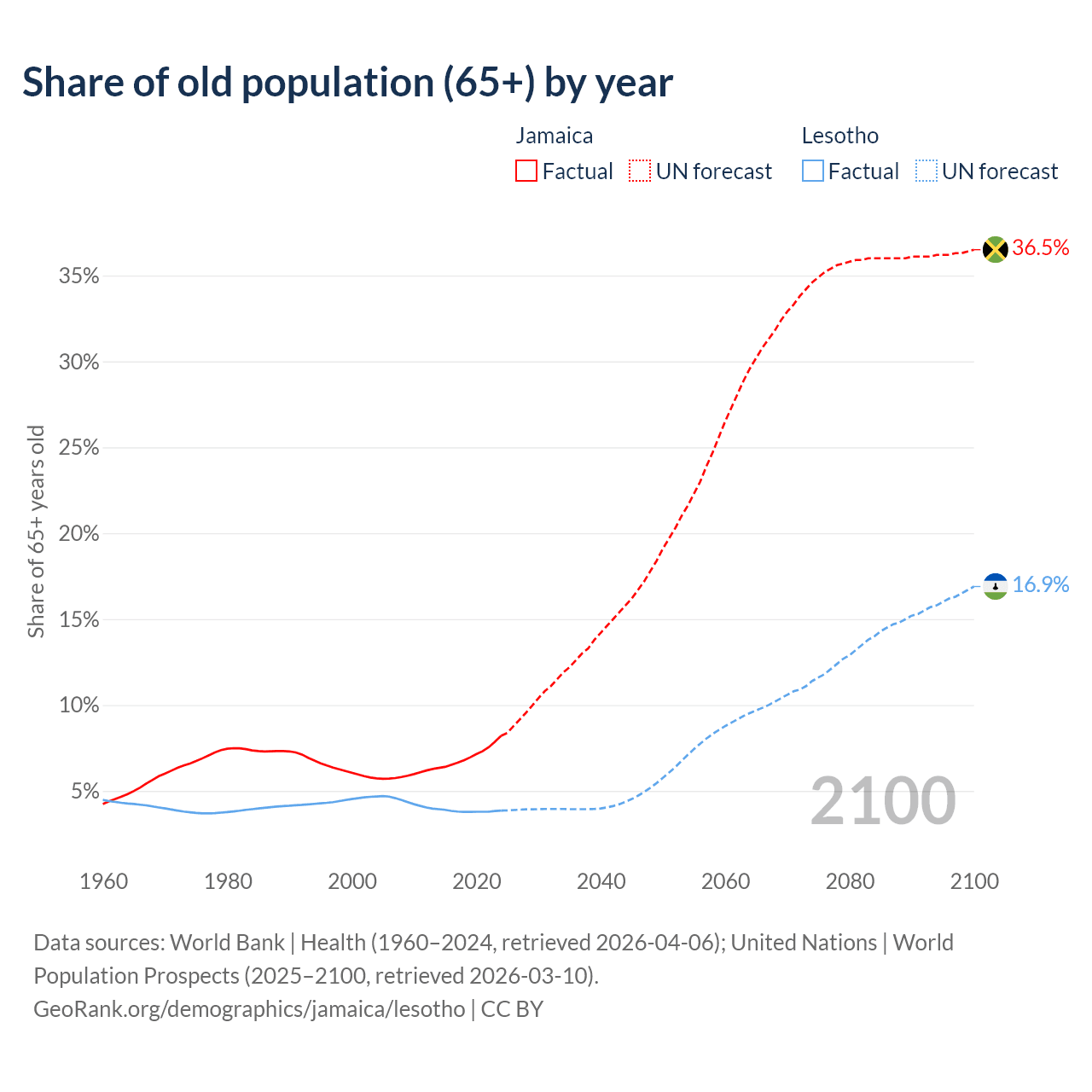 - The share of old-age demographic (65+) in Jamaica is 8.21% vs 3.86% in Lesotho.