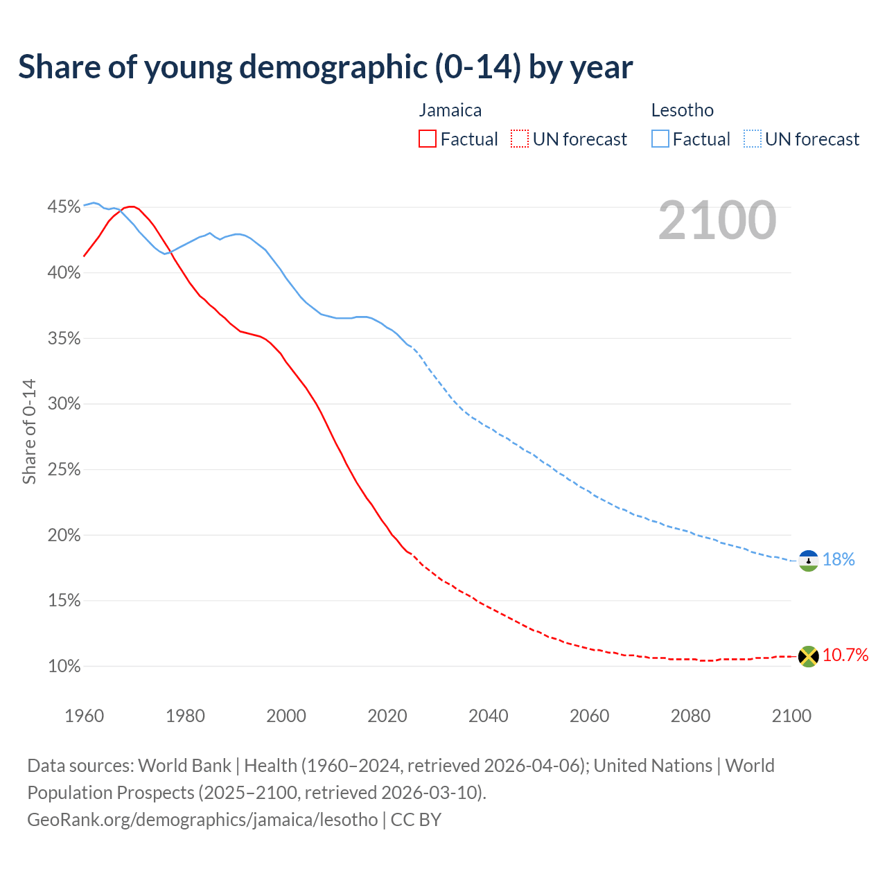 - The share of young demographic (0-15 years old) in Jamaica is 18.7% vs 34.5% in Lesotho.
