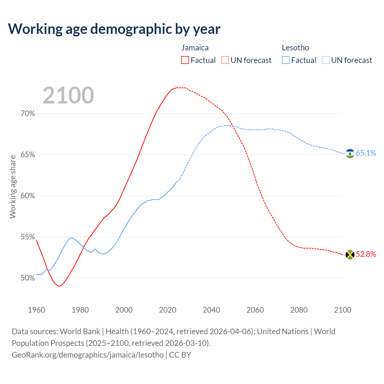 - Jamaica has 2.07M working age adults (aged 15-64) vs 1.48M in Lesotho.