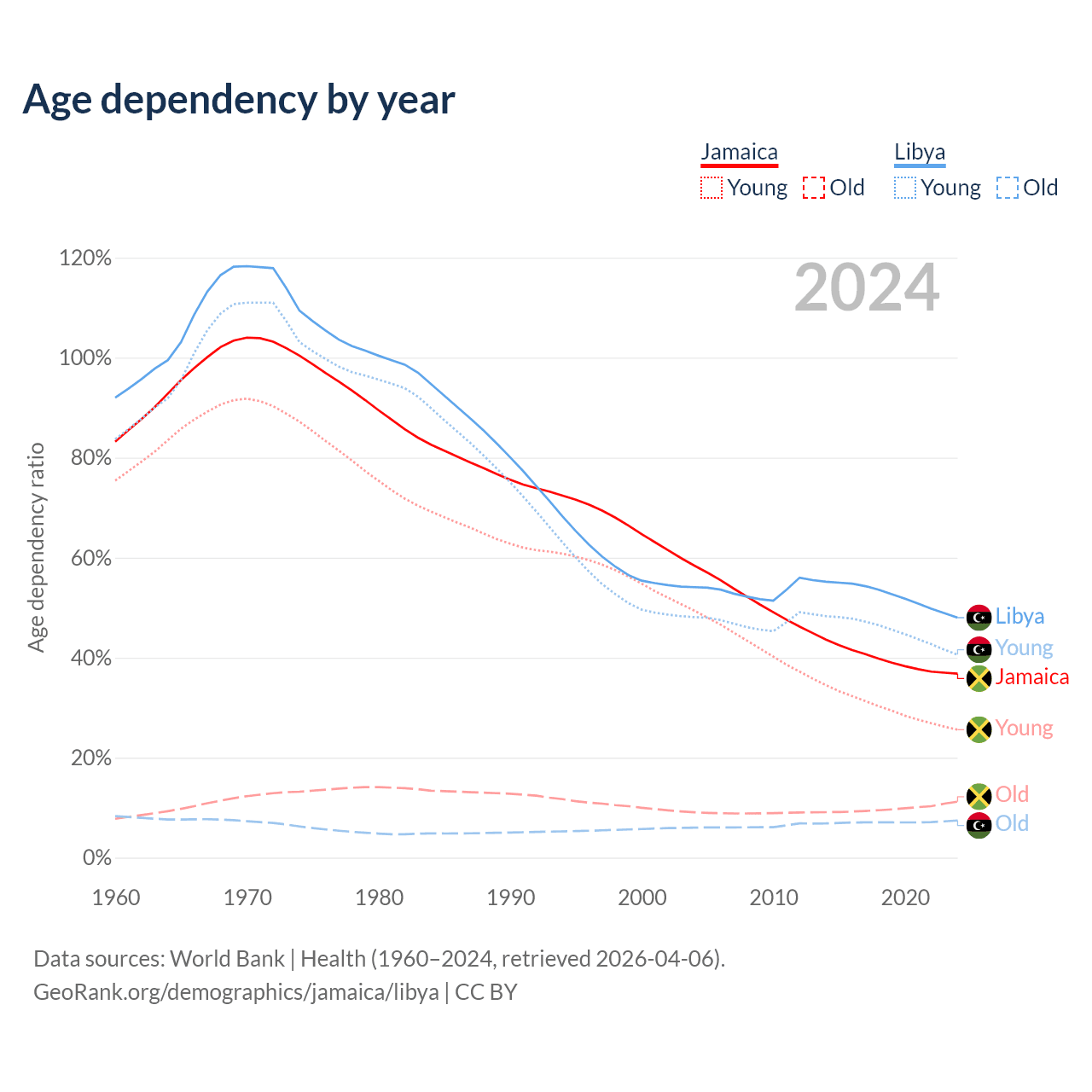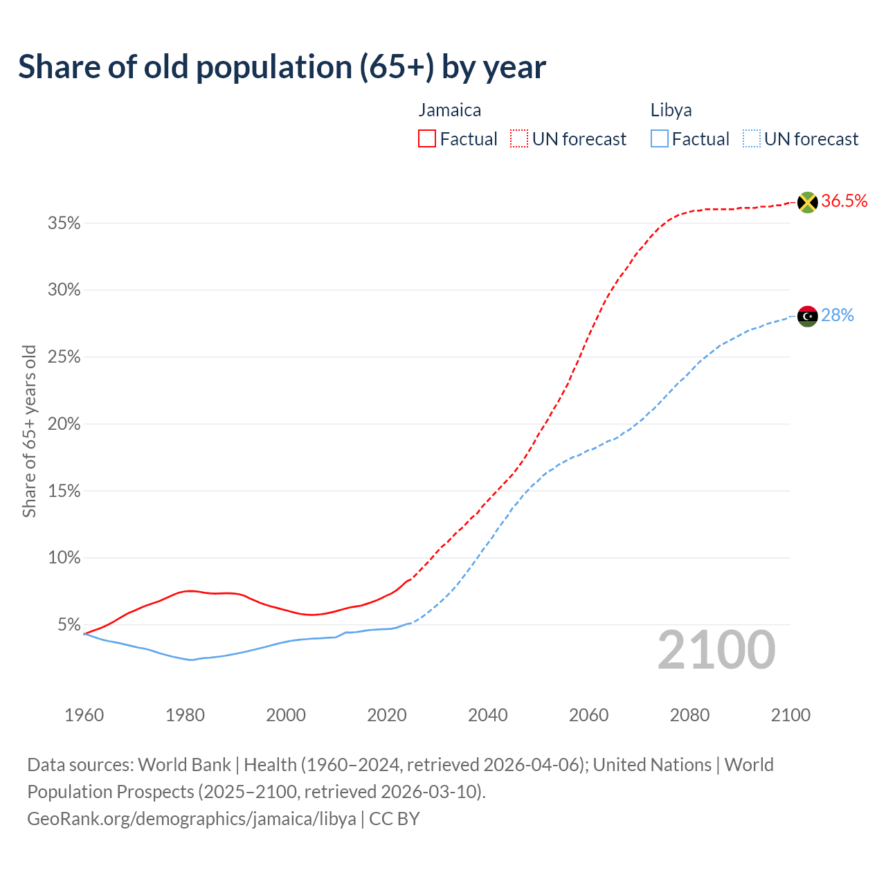 - The share of old-age demographic (65+) in Jamaica is 8.21% vs 5.02% in Libya.