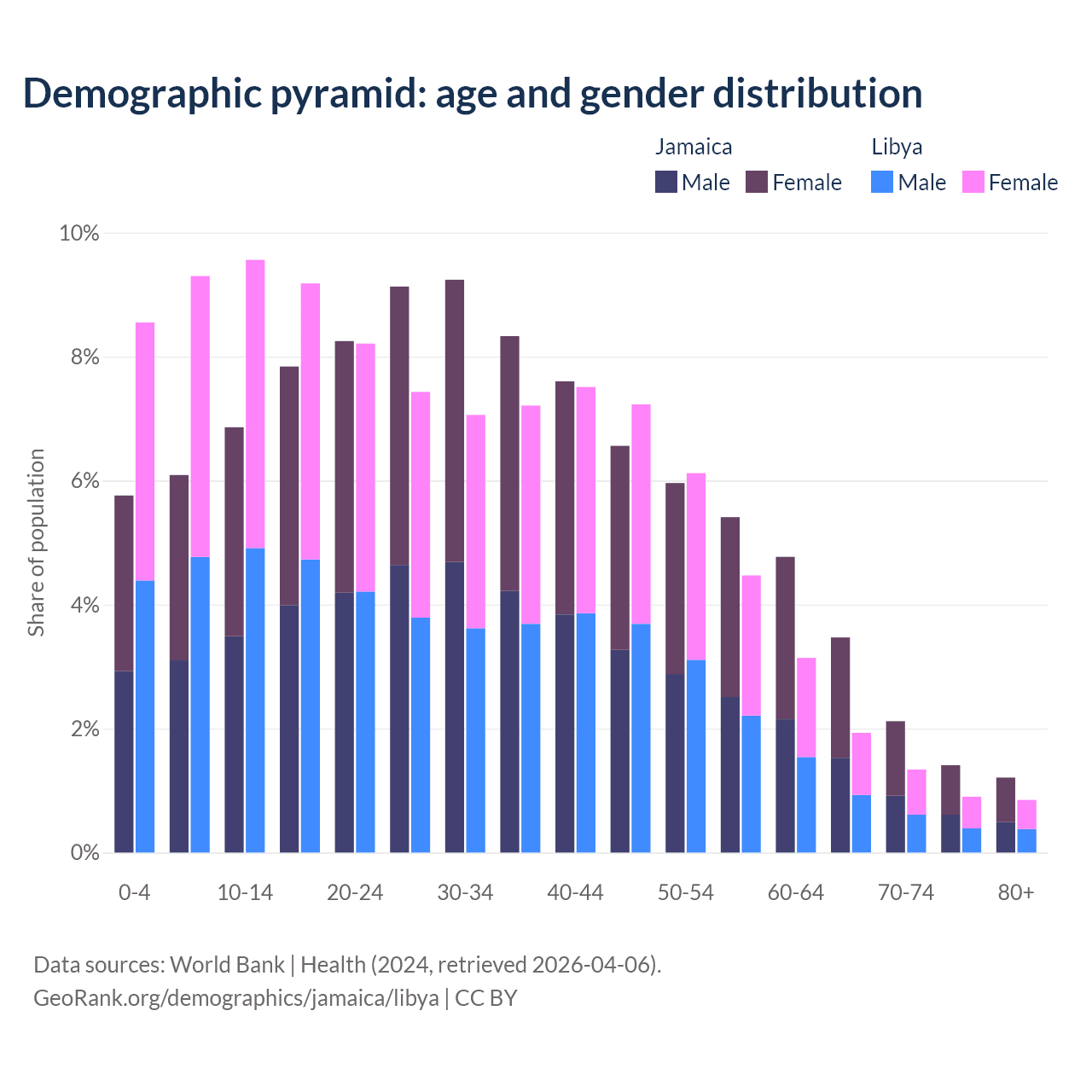 - Jamaica is ranked 87/196 by median age (oldest to youngest) vs 114/196 for Libya.