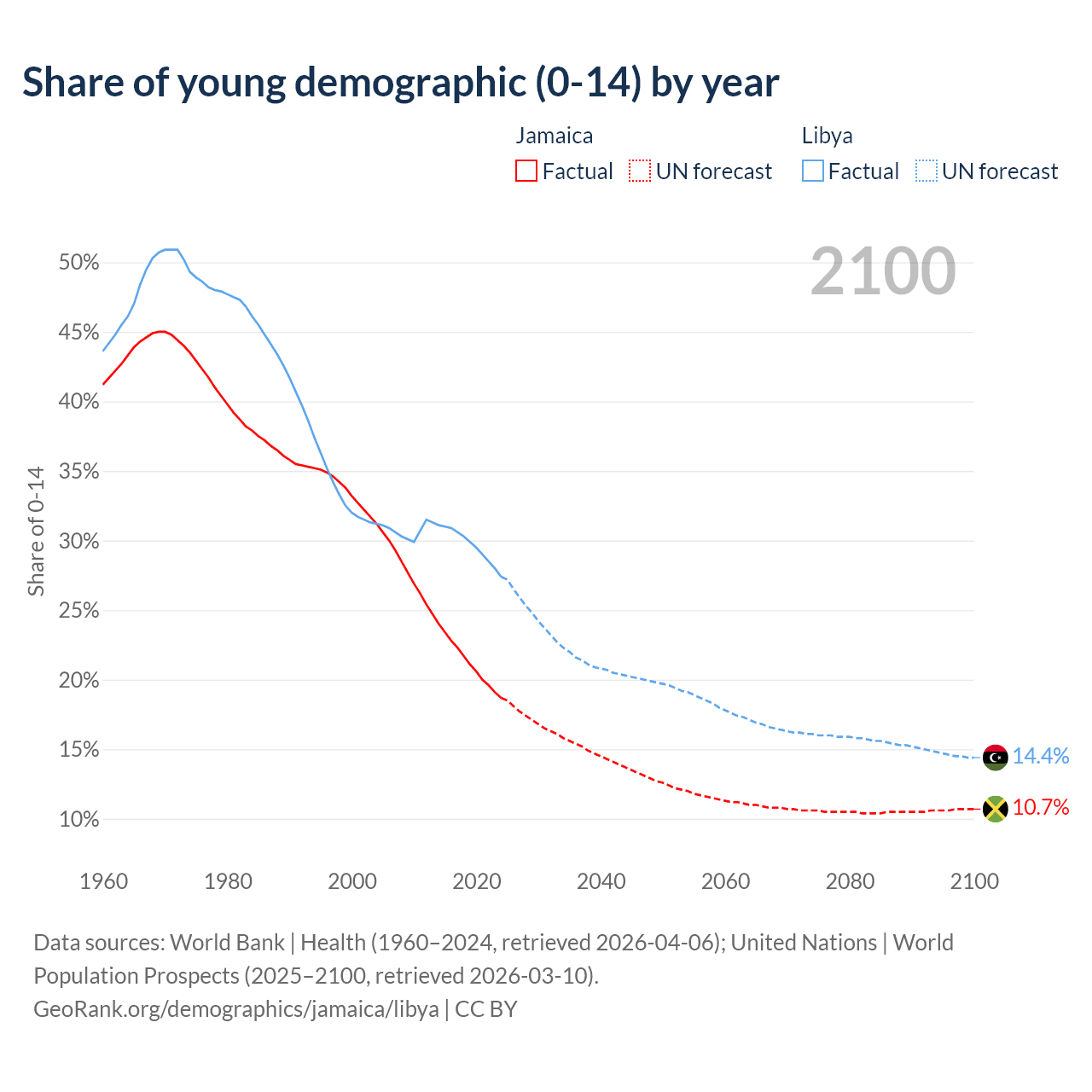 - The share of young demographic (0-15 years old) in Jamaica is 18.7% vs 27.4% in Libya.
