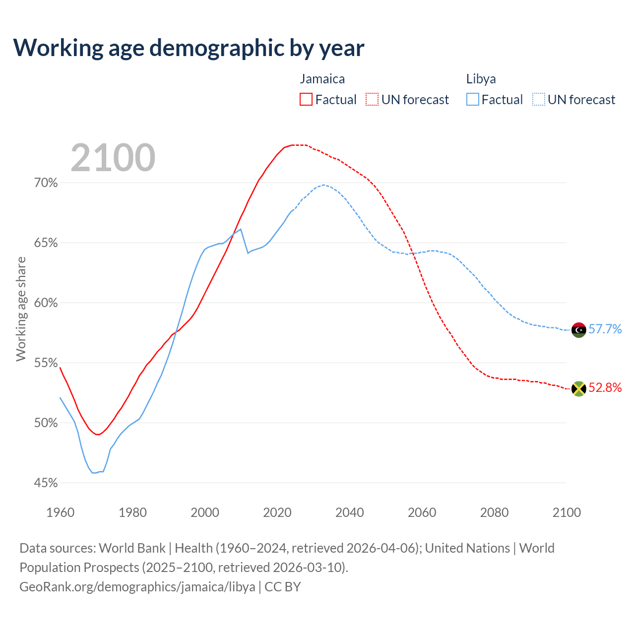 - Jamaica has 2.07M working age adults (aged 15-64) vs 5.11M in Libya.