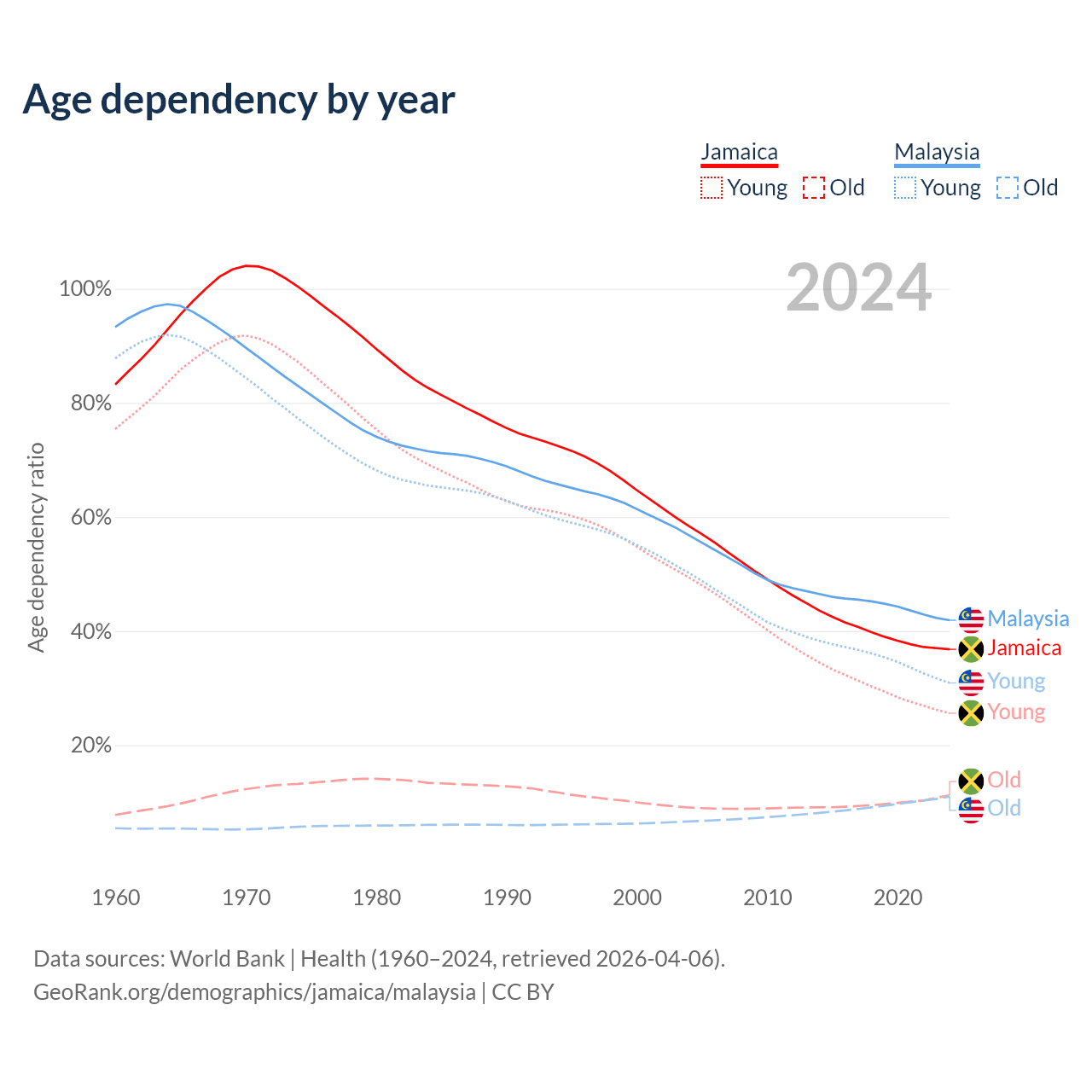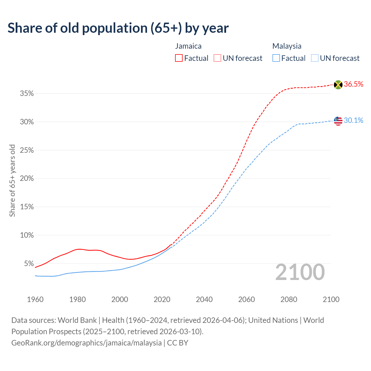 - The share of old-age demographic (65+) in Jamaica is 8.21% vs 7.74% in Malaysia.