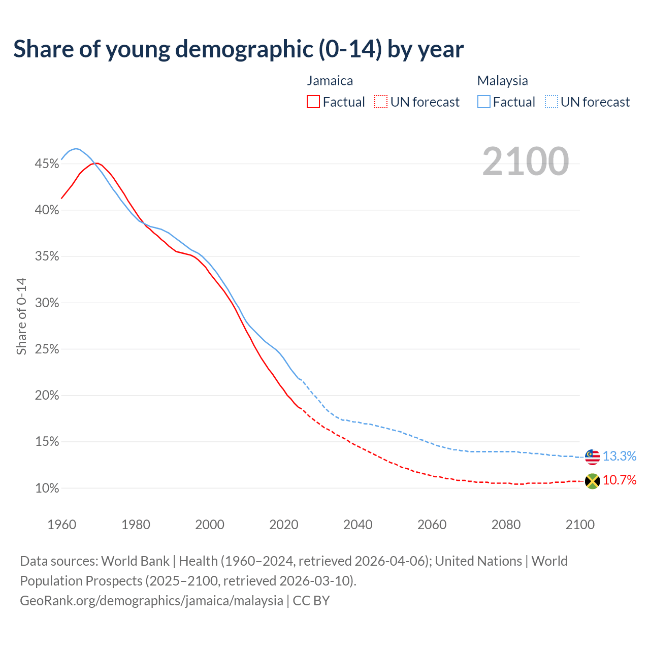 - The share of young demographic (0-15 years old) in Jamaica is 18.7% vs 21.8% in Malaysia.