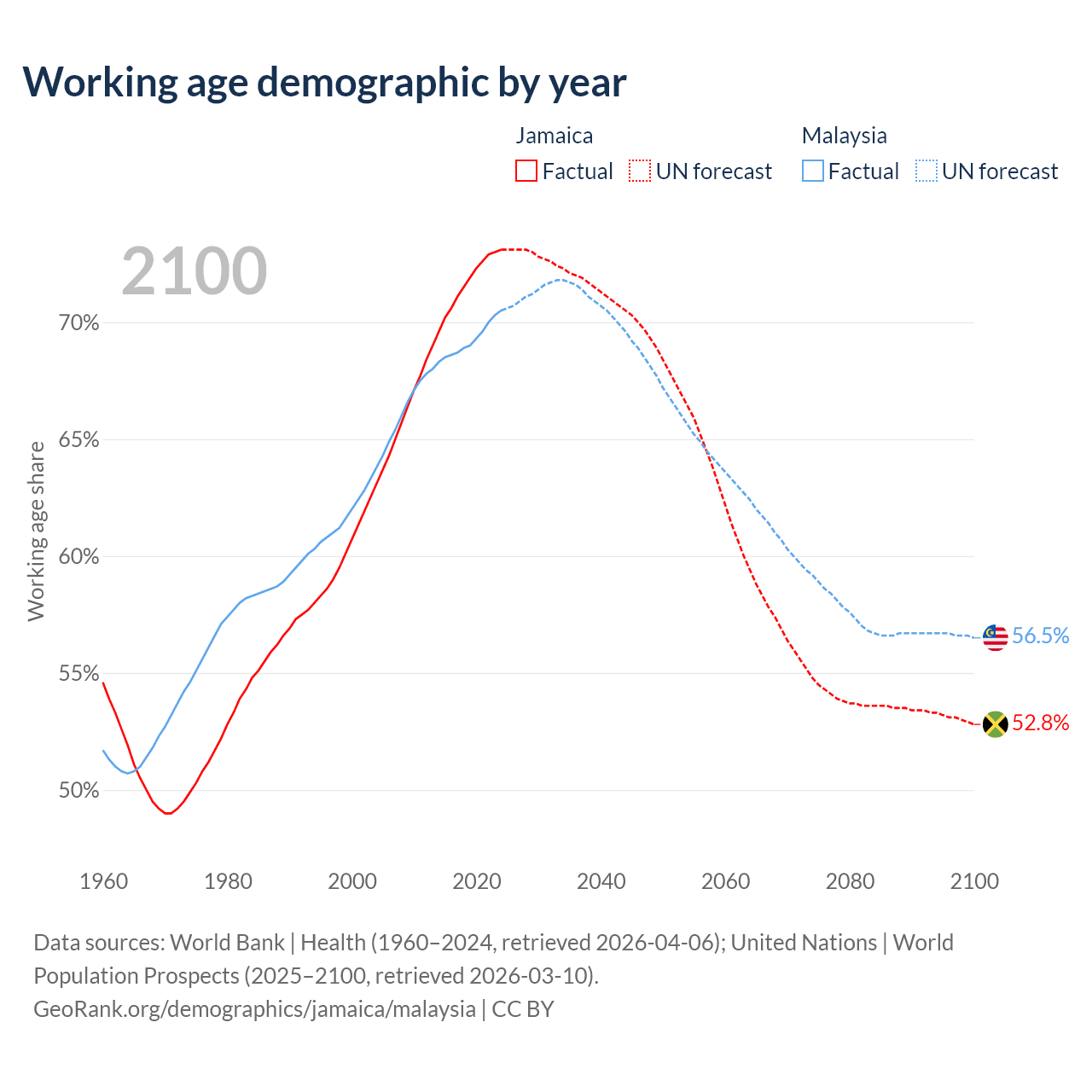 - Jamaica has 2.07M working age adults (aged 15-64) vs 25.7M in Malaysia.